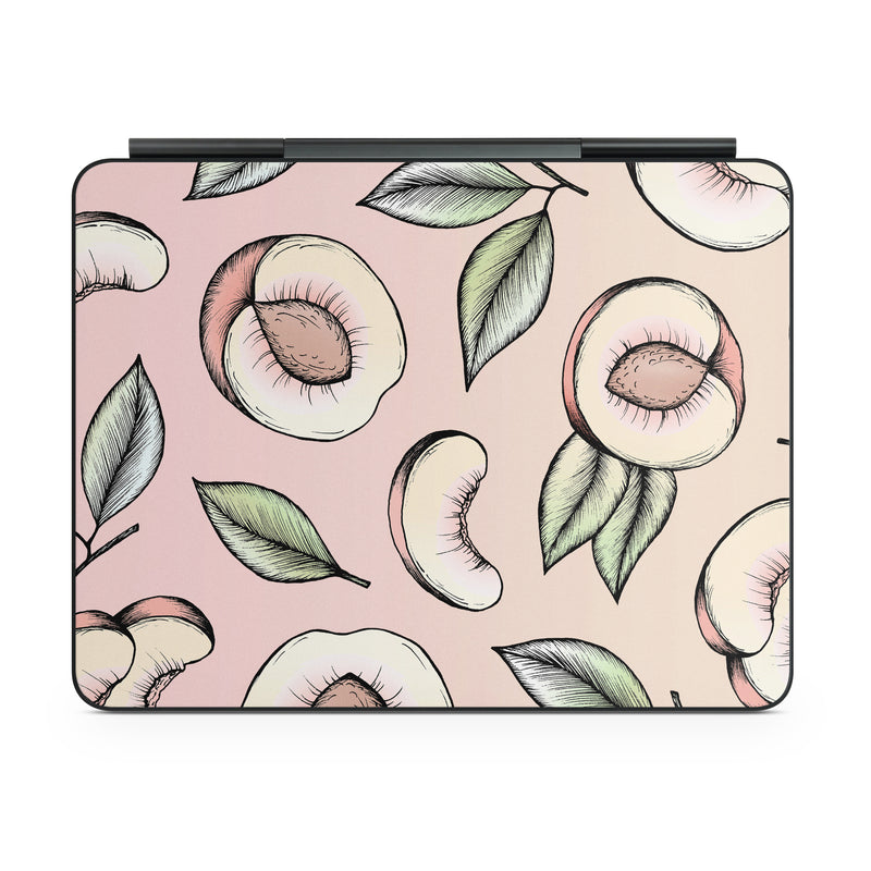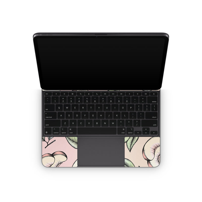 iStyles Magic Keyboard for iPad Series Skin design of Pattern, Leaf, Botany, Organism, Design, Plant, Illustration, Clip art, with pink, green, yellow, orange colors, and tagged with objects, patterns, fruit, leaf, leaves, nature, outdoors, pastel, peach, peaches, sketch.