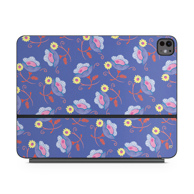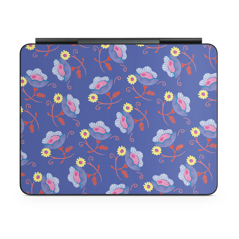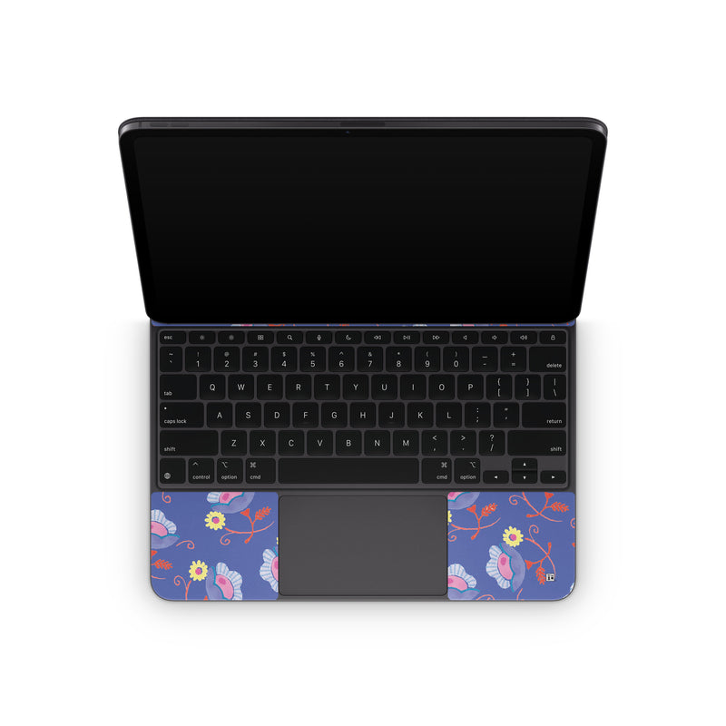 iStyles Magic Keyboard for iPad Series Skin design of Azure, Textile, Rectangle, Art, Aqua, Painting, Pattern, Electric blue, Font, Visual arts, with purple, red, yellow, pink colors, and tagged with patterns, flowers, purple, flower, pattern.