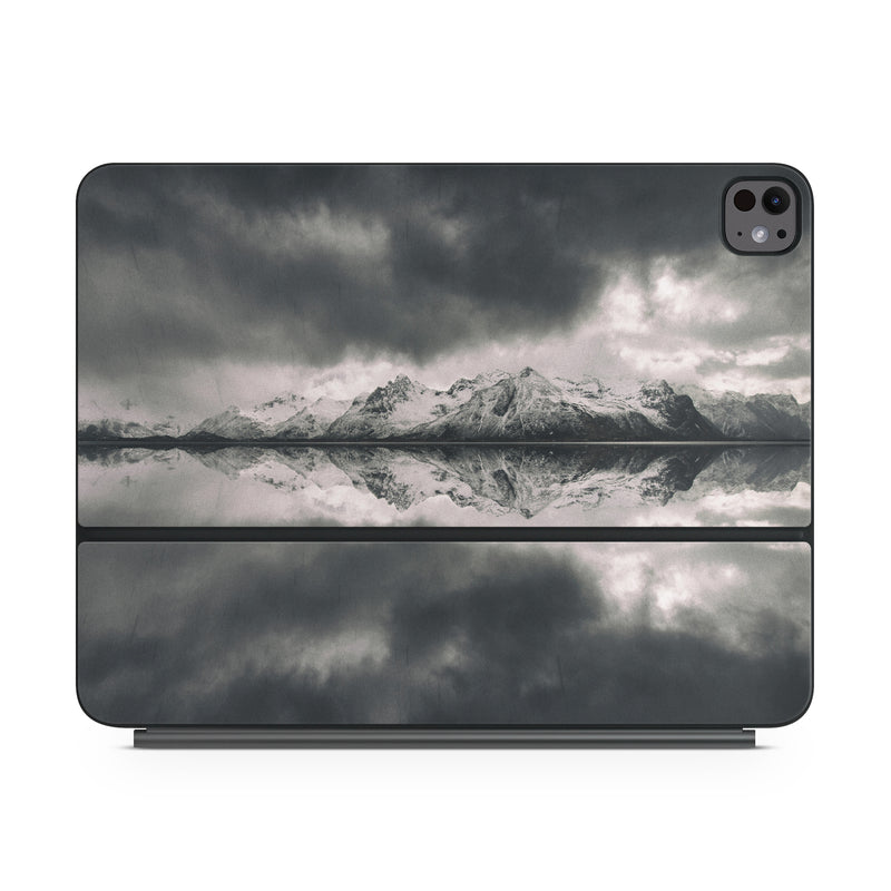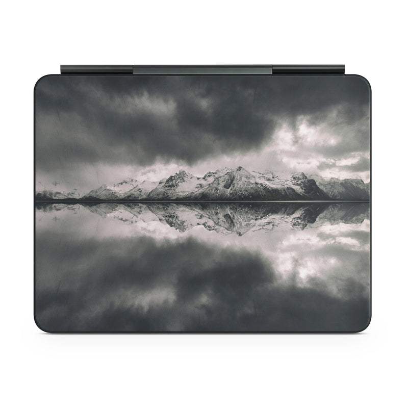 iStyles Magic Keyboard for iPad Series Skin design of Sky, Cloud, Nature, Reflection, Water, Atmospheric phenomenon, Daytime, Black-and-white, Atmosphere, Calm, with white, black, gray colors, and tagged with nature, photos, dark, lake, landscape, mountains, photo, photography.