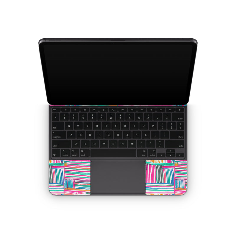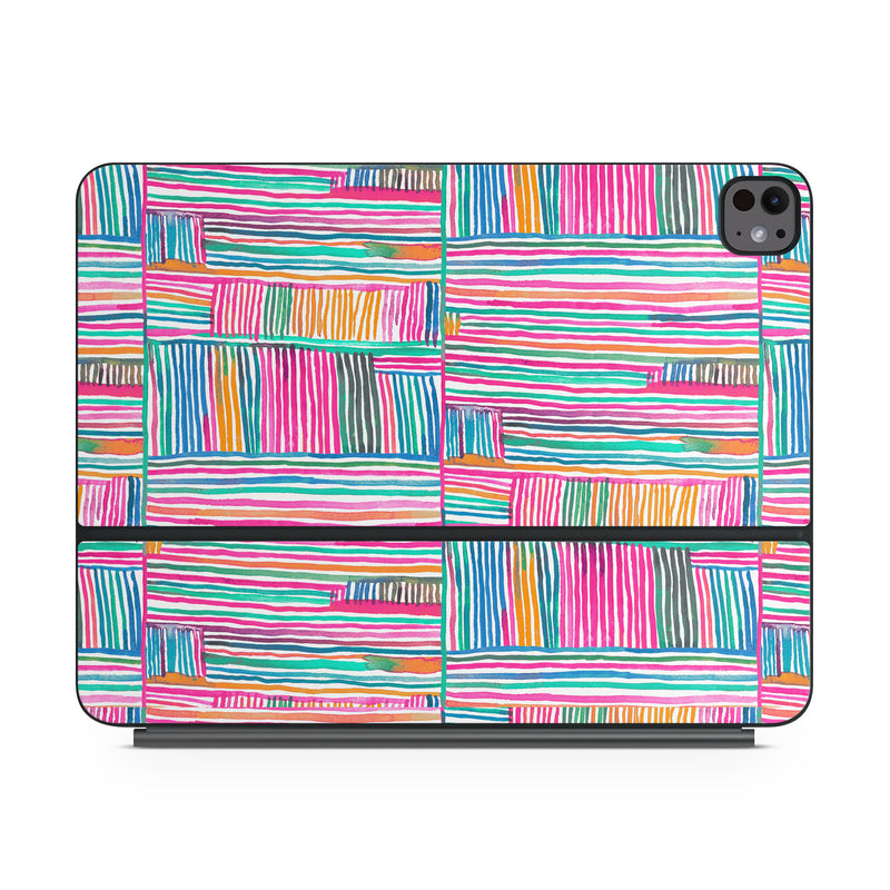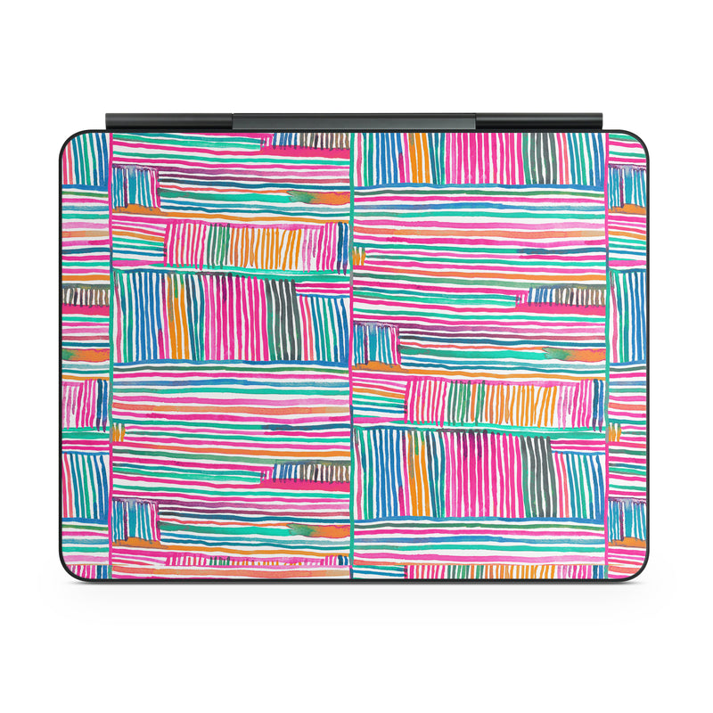 iStyles Magic Keyboard for iPad Series Skin design of Colorfulness, Product, Rectangle, Azure, Textile, Art, Aqua, Material property, Magenta, Tints and shades, with white, pink, orange, green, blue, yellow colors, and tagged with patterns, stripes, pattern.