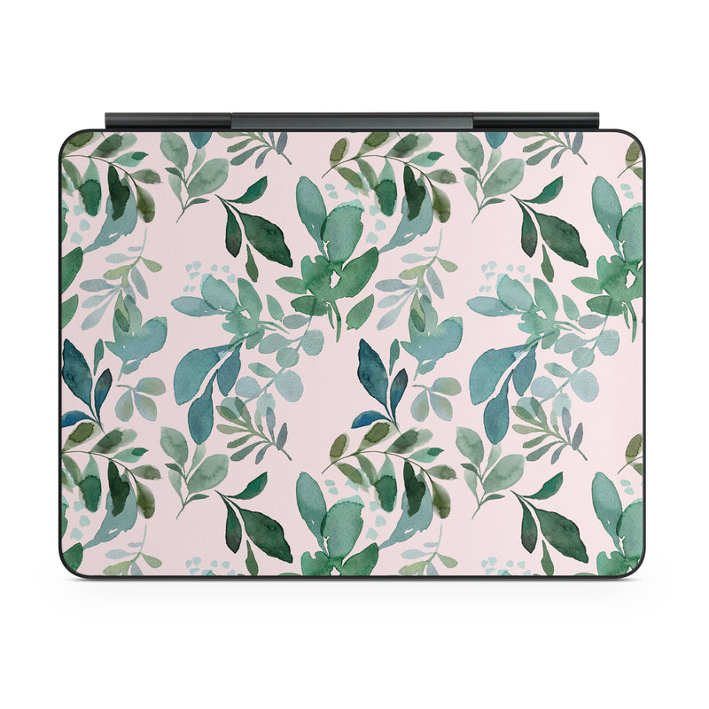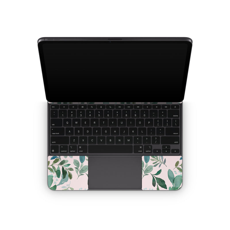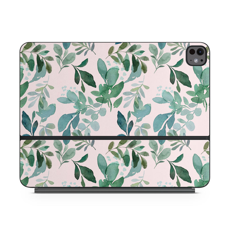 iStyles Magic Keyboard for iPad Series Skin design of Pattern, Green, Leaf, Design, Plant, Tree, Military camouflage, with white, green, blue colors, and tagged with nature, patterns, filigree, green, greenery, leaf, leaves, nature, outdoors, pastel, watercolor.
