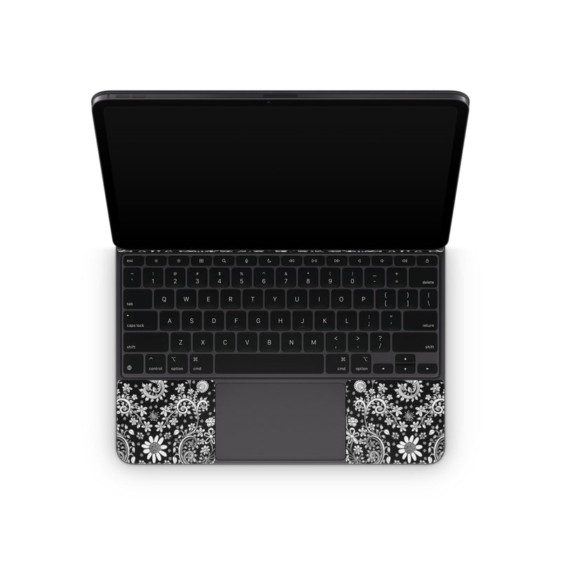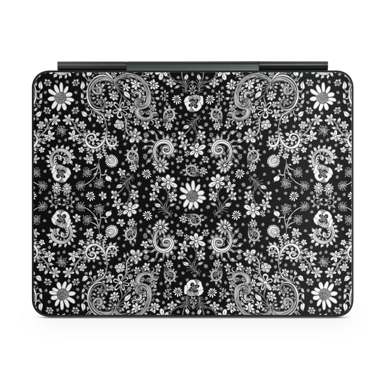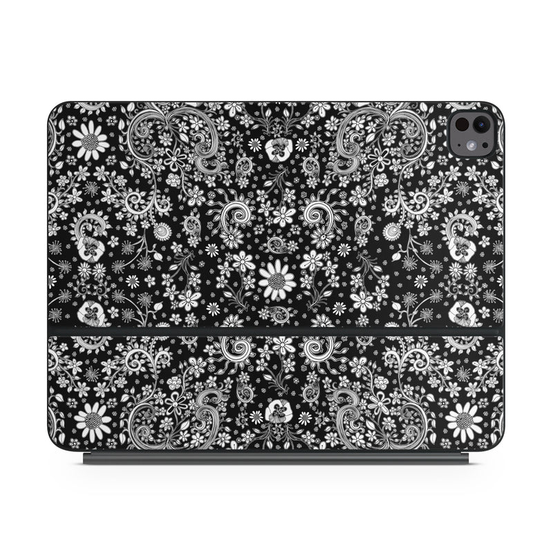 iStyles Magic Keyboard for iPad Series Skin design of Pattern, Monochrome, Design, Black-and-white, Visual arts, Textile, Motif, Monochrome photography, Symmetry, with black, white colors, and tagged with patterns, flowers, blackandwhite, doodles, florals, flowers, sketches.