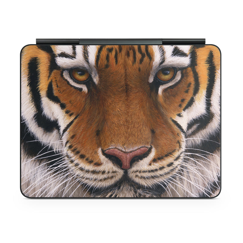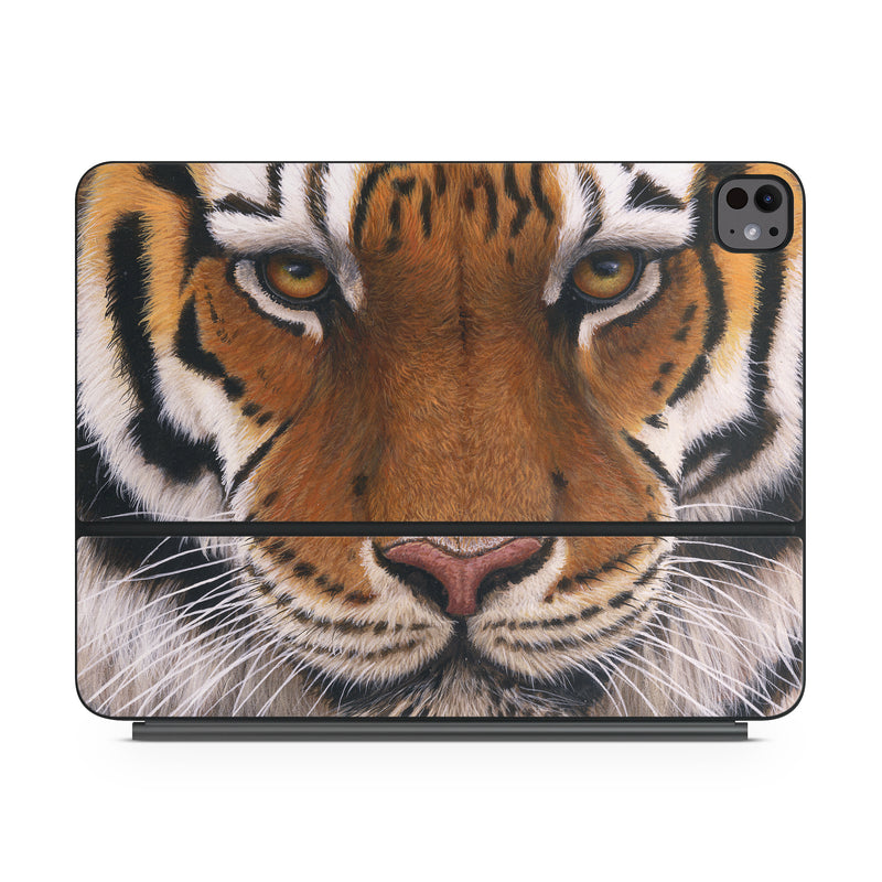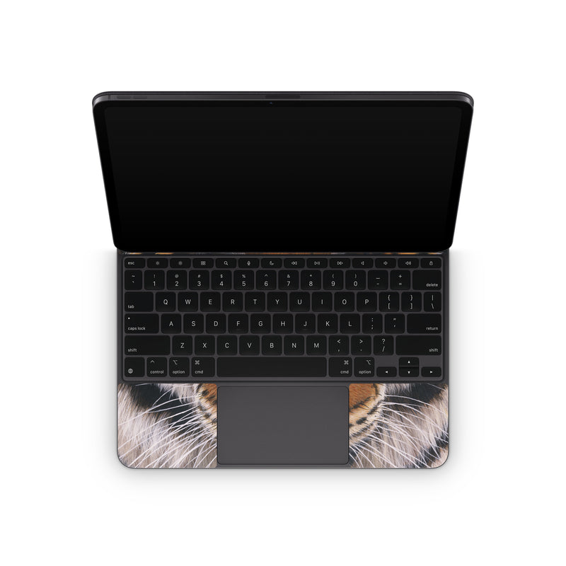 iStyles Magic Keyboard for iPad Series Skin design of Tiger, Mammal, Wildlife, Terrestrial animal, Vertebrate, Bengal tiger, Whiskers, Siberian tiger, Felidae, Snout, with black, gray, red, green, pink colors, and tagged with animals.