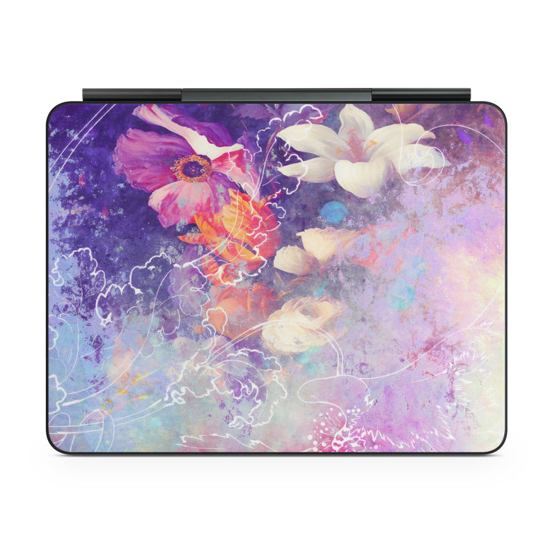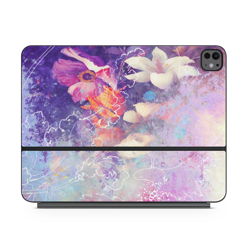 iStyles Magic Keyboard for iPad Series Skin design of Purple, Violet, Pink, Graphic design, Illustration, Sky, Art, Design, Watercolor paint, Graphics, with purple, white, red, orange, blue colors, and tagged with flowers, floral, flowers, nature, outline, pastel, sketch.