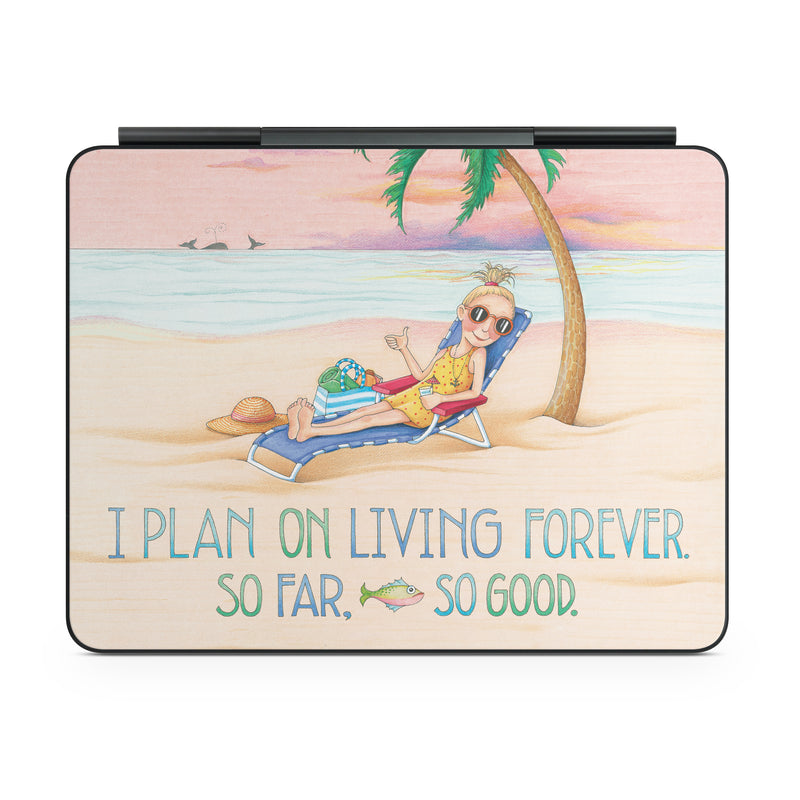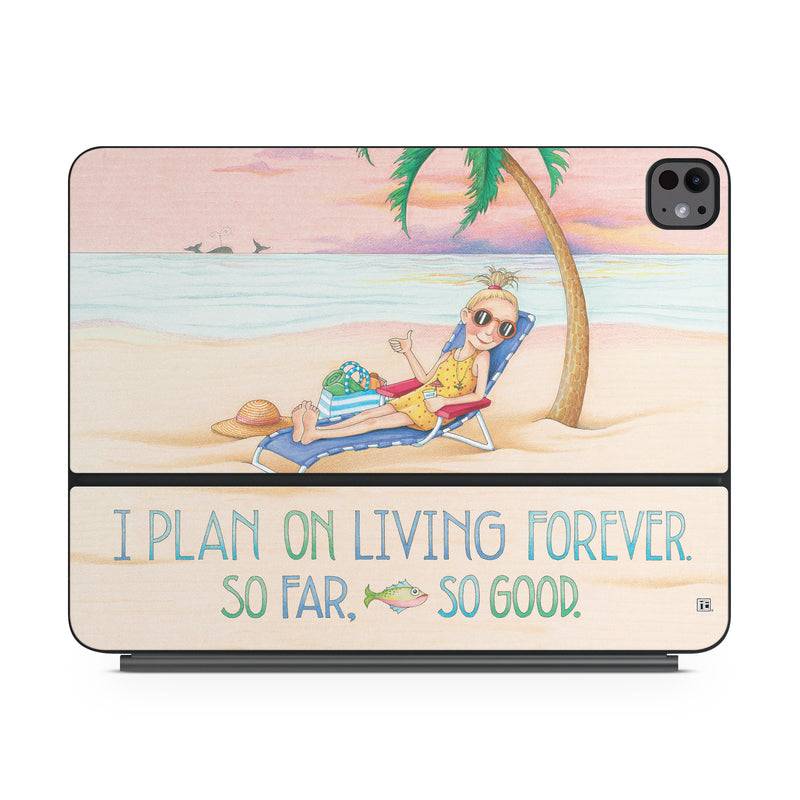 iStyles Magic Keyboard for iPad Series Skin design of Vacation, Product, Summer, Aqua, Illustration, Sun tanning, Fictional character, Caribbean, Graphics, Happy, with pink, green, brown, yellow, blue, white, red colors, and tagged with signs, people, animals, beach, humor, ocean, palmtree.