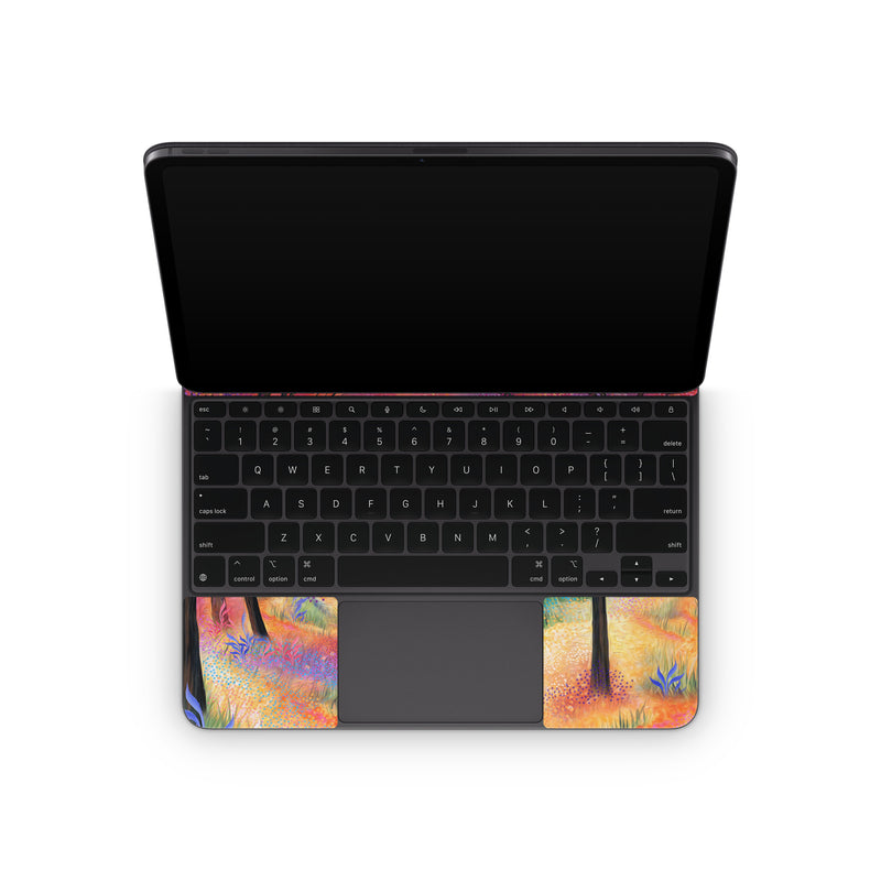 iStyles Magic Keyboard for iPad Series Skin design of Plant, Art paint, Paint, Botany, Natural environment, Natural landscape, Leaf, Branch, People in nature, Tree, with red, blue, yellow, green, purple, orange, black, white colors, and tagged with nature, fineart, blue, forest, meadow, pink, purple, sunset, tree, trees, yellow.