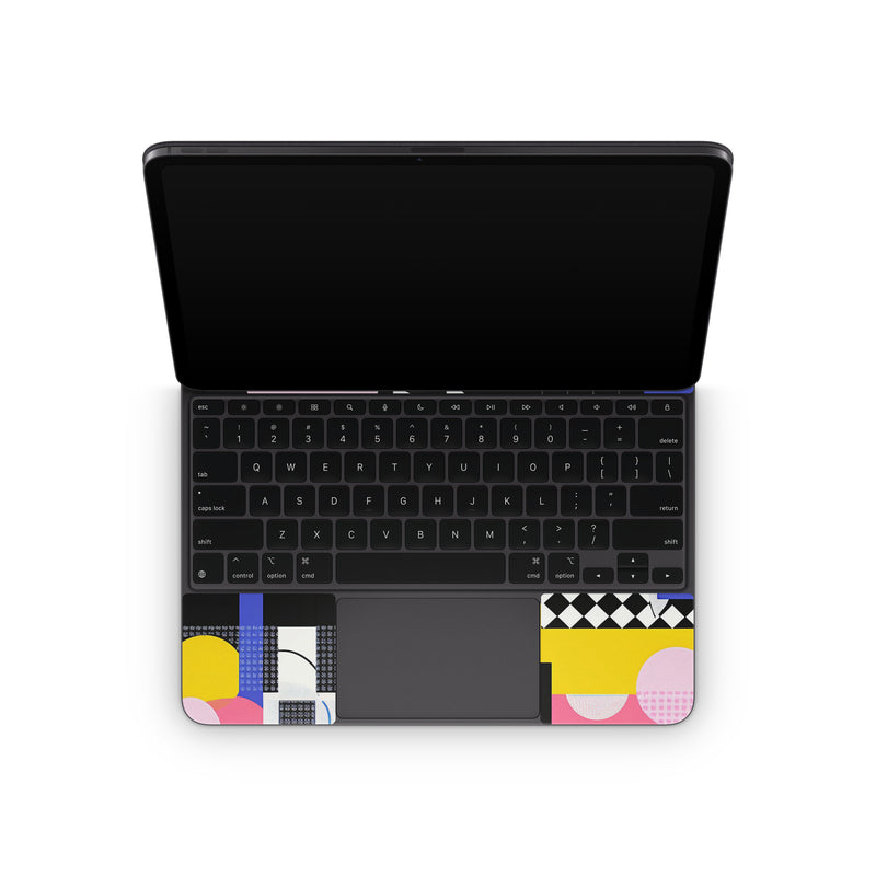 iStyles Magic Keyboard for iPad Series Skin design of White, Black, Rectangle, Font, Art, Red, Pattern, Tints and shades, Circle, Electric blue, with blue, white, black, yellow, pink, purple colors, and tagged with abstract, abstract, circles, squares, checkered, stripes, dots.