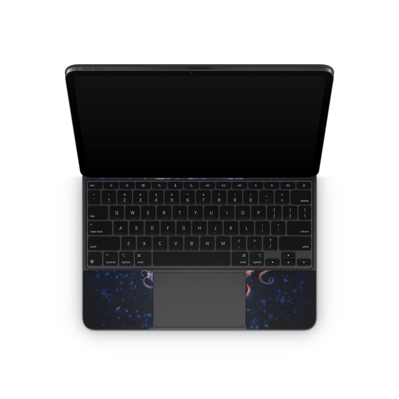 iStyles Magic Keyboard for iPad Series Skin design of Water, Azure, Marine invertebrates, Liquid, Natural environment, Organism, Fluid, Art, Font, World, with blue, red, white, purple colors, and tagged with animals, fantasy, flowers, nature, octopus, squid, sea, ocean.
