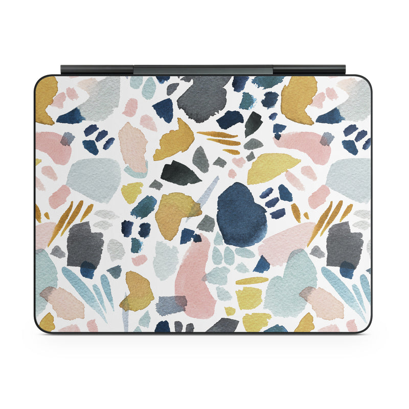 iStyles Magic Keyboard for iPad Series Skin design of Pattern, Aqua, Teal, Design, Textile, with white, blue, yellow, orange, pink, black colors, and tagged with patterns, collage, color, colors, mosaic, pastel, pastels, stamp, tile, tiles.