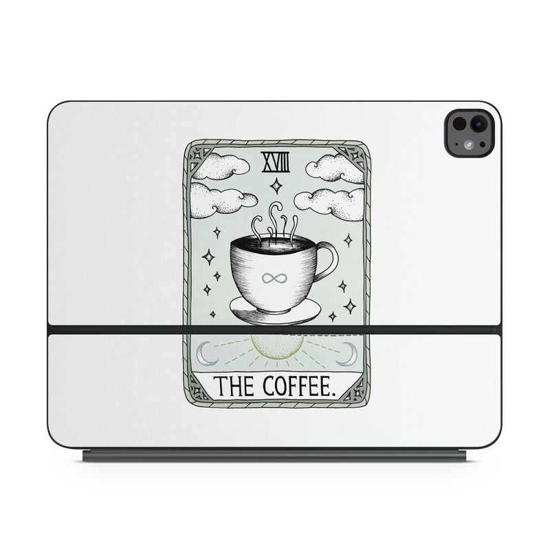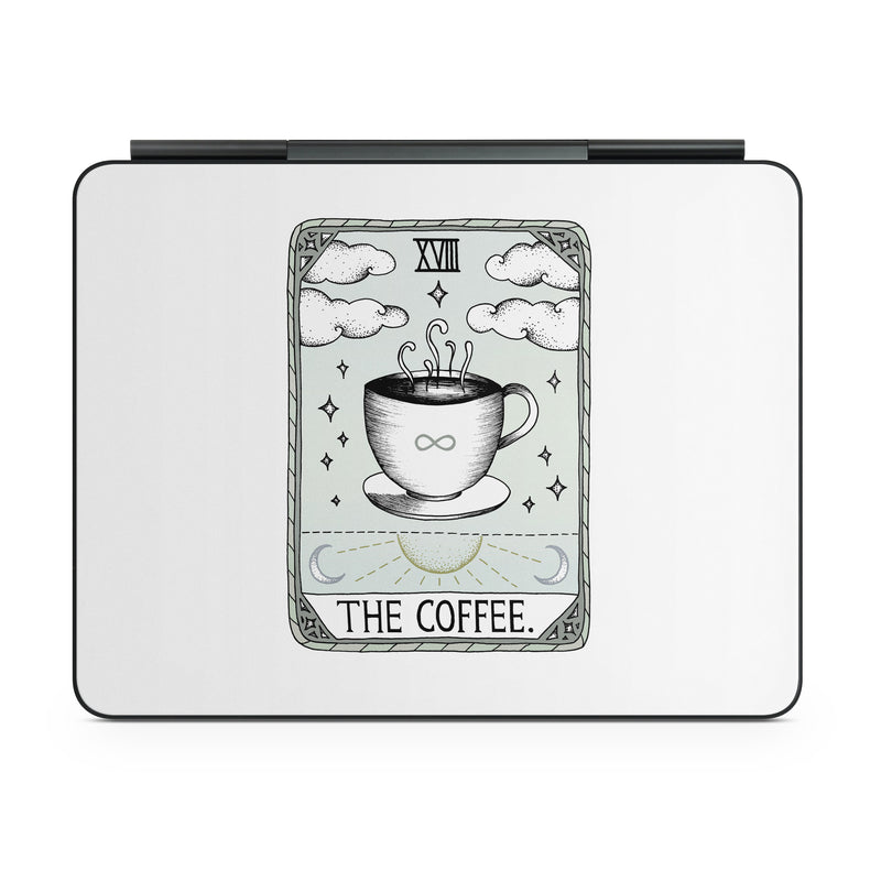 iStyles Magic Keyboard for iPad Series Skin design of Cup, Cartoon, Drinkware, Coffee cup, Tableware, Teacup, Illustration, Drink, Line art, with white, black, green, gray, yellow colors, and tagged with objects, signs, space, coffee, handdrawn, pastel, sketch, tarot.