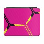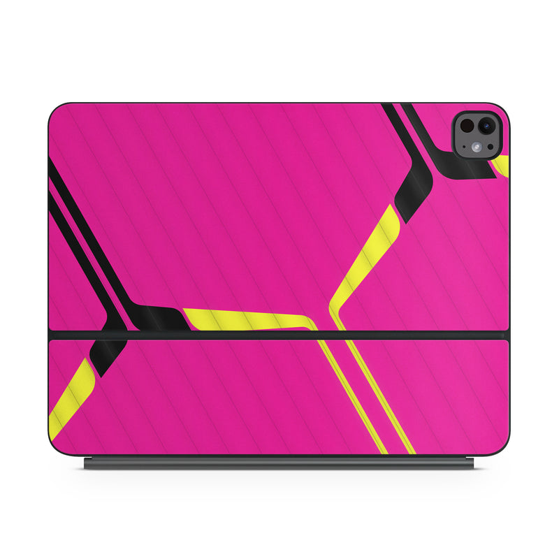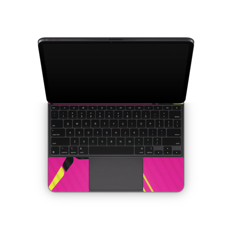 iStyles Magic Keyboard for iPad Series Skin design of Purple, Textile, Sleeve, Jersey, Violet, Triangle, Font, Magenta, Collar, Parallel, with pink, black, yellow colors, and tagged with patterns, hexagon, pattern, lines.