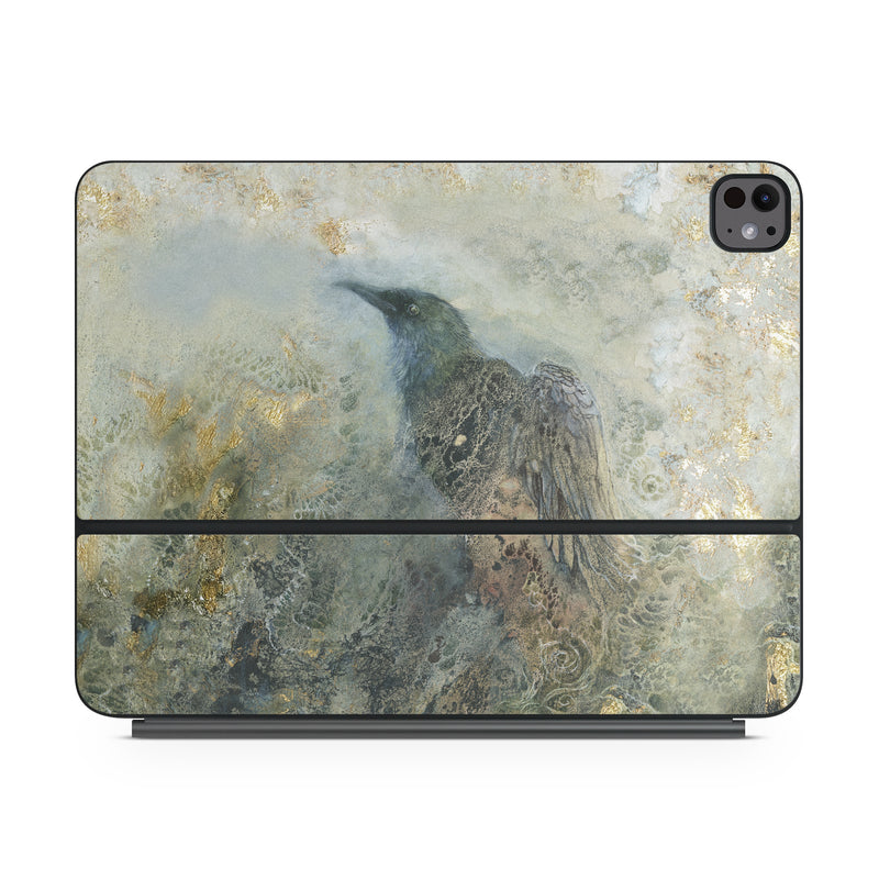 iStyles Magic Keyboard for iPad Series Skin design of Painting, Water, Geology, Art, Rock, Watercolor paint, Illustration, with black, gray, white, blue colors, and tagged with animals, abstract, bird, birds, raven.