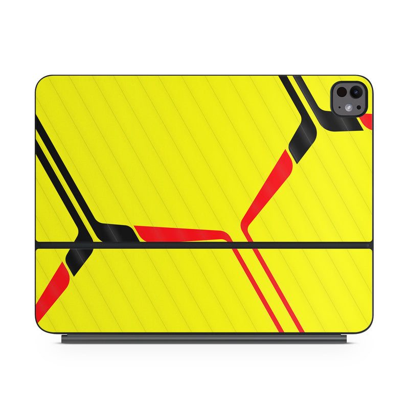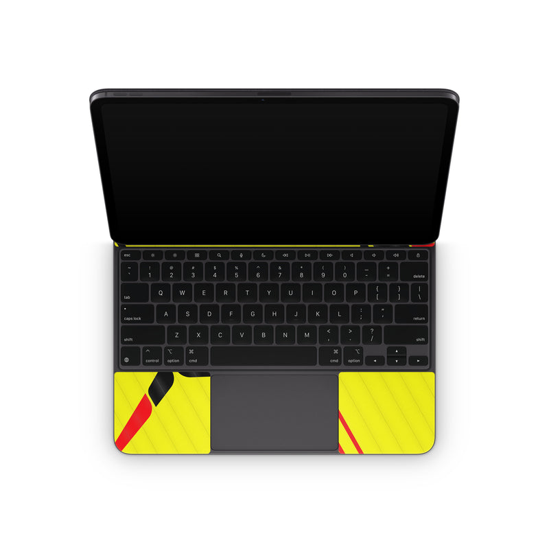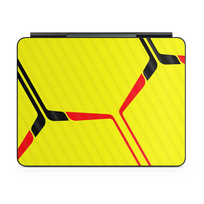 iStyles Magic Keyboard for iPad Series Skin design of Rectangle, Yellow, Parallel, Font, Tints and shades, Wood, Triangle, Pattern, Graphics, Symmetry, with yellow, black, red colors, and tagged with patterns, hexagon, pattern, lines.