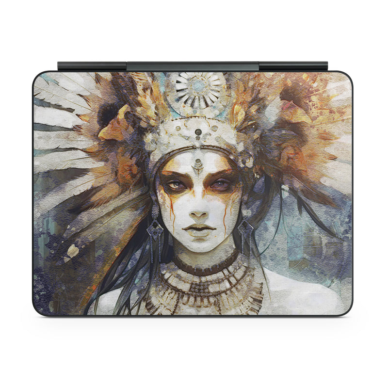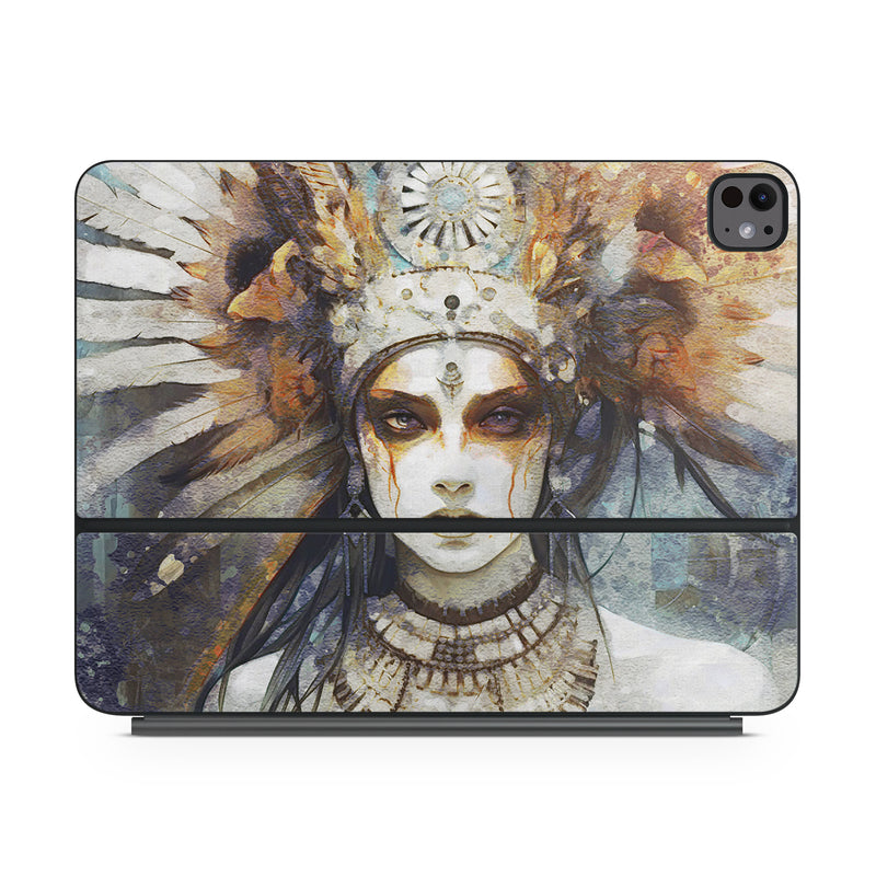 iStyles Magic Keyboard for iPad Series Skin design of Eye, Paint, Eyelash, Painting, Art, Headpiece, Beauty, Feather, Illustration, Mask, with white, black, yellow, brown, gray, blue colors, and tagged with flowers, people, woman, .