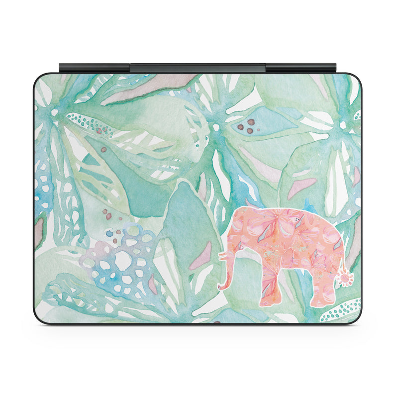 iStyles Magic Keyboard for iPad Series Skin design of Aqua, Turquoise, Pattern, Wrapping paper, Design, Illustration, Plant, Gift wrapping, Art, with blue, pink, white, green colors, and tagged with abstract, animals, flowers, animals, blue, bright, elephant, floral, flowers, pink, plants, tropical, watercolor.