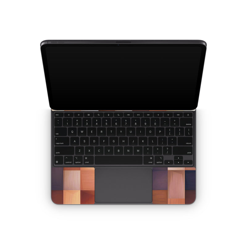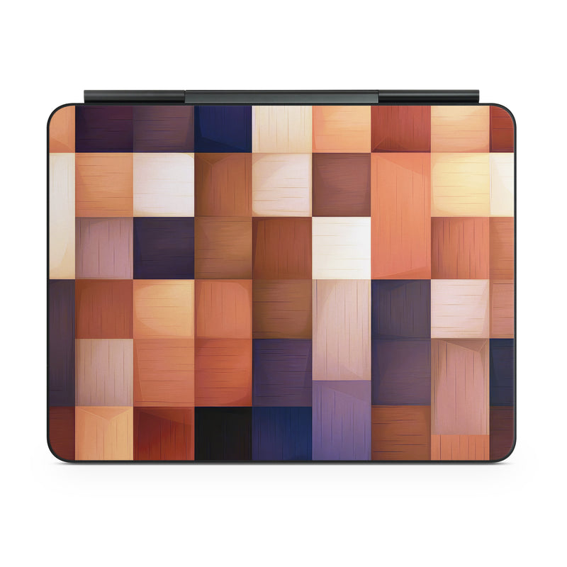 iStyles Magic Keyboard for iPad Series Skin design of Brown, Light, Rectangle, Product, Wood, Blue, Orange, Amber, Textile, Wood stain, with yellow, orange, red, black, brown, blue, purple colors, and tagged with patterns, autumn, fall, pattern, squares.