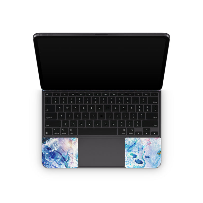 iStyles Magic Keyboard for iPad Series Skin design of Psychedelic art, Water, Fractal art, Art, Pattern, Graphic design, Design, Illustration, Electric blue, Visual arts, with blue, purple, green, red, gray, white colors, and tagged with animals, nature, flowers.