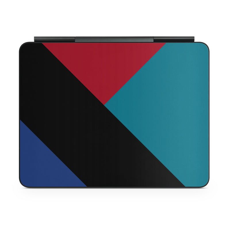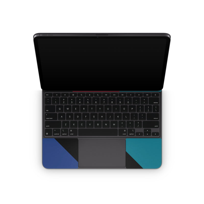 iStyles Magic Keyboard for iPad Series Skin design of Blue, Green, Turquoise, Azure, Teal, Electric blue, Line, Pattern, Design, Graphic design, with black, blue, red colors, and tagged with patterns, block, blocking, color, colorblock, geometric, shape, simple.