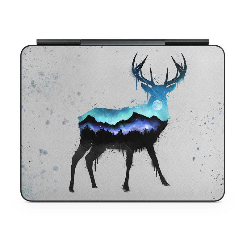 iStyles Magic Keyboard for iPad Series Skin design of Reindeer, Deer, Illustration, Watercolor paint, Art, Elk, Wildlife, Drawing, Paint, Graphics, with gray, black, blue, purple, white colors, and tagged with animals, nature, space, animals, deer, moon, nature, night, stars, watercolor.