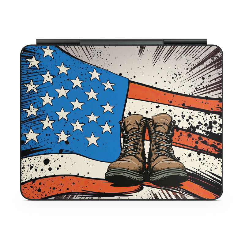 iStyles Magic Keyboard for iPad Series Skin design of Footwear, Shoe, Walking shoe, Outdoor shoe, Line, Flag of the united states, Sneakers, Font, Art, Human leg, with red, blue, white, black, brown, gray colors, and tagged with flags, objects, signs, military, united, states, flag, military, boots, walking, training.