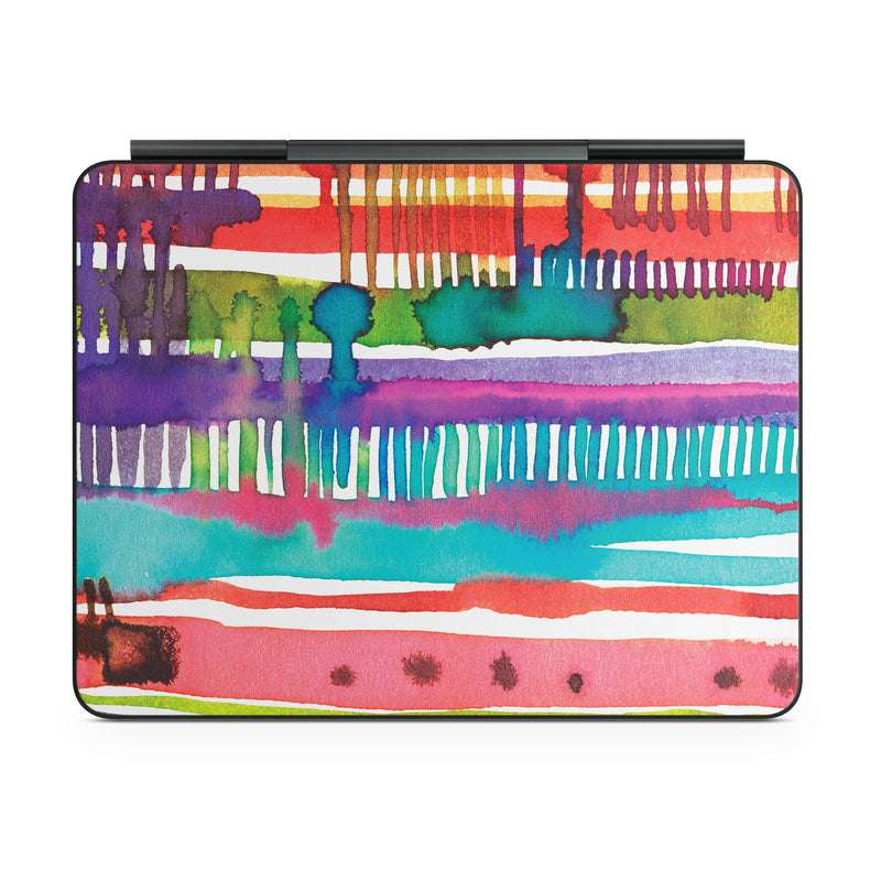 iStyles Magic Keyboard for iPad Series Skin design of Textile, Art, Magenta, Hair accessory, with white, red, orange, yellow, green, blue, purple, brown, pink colors, and tagged with patterns, abstract, abstract, bright, colorful, nature, watercolor.