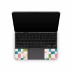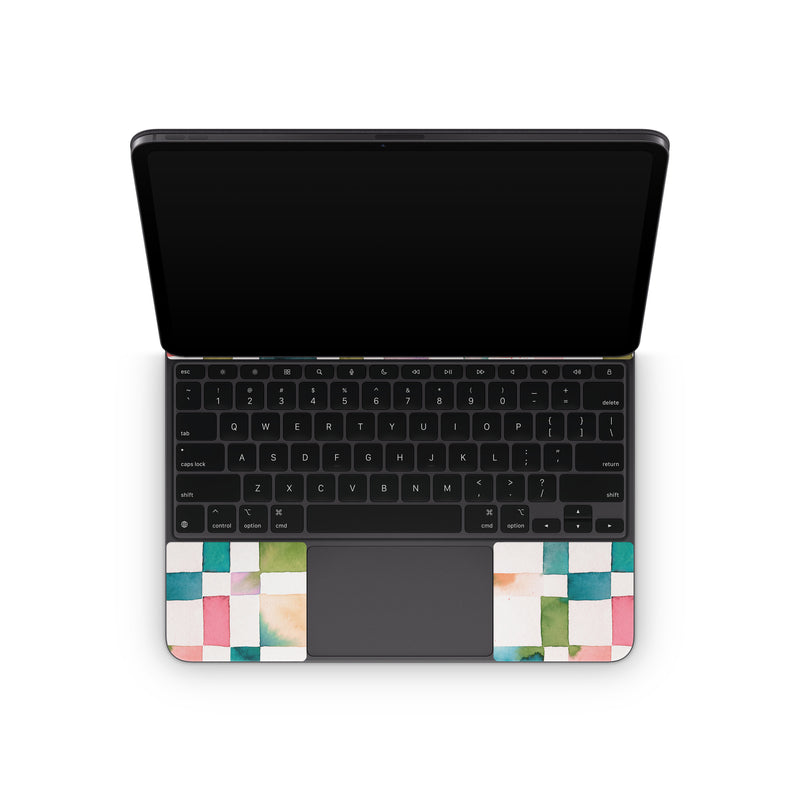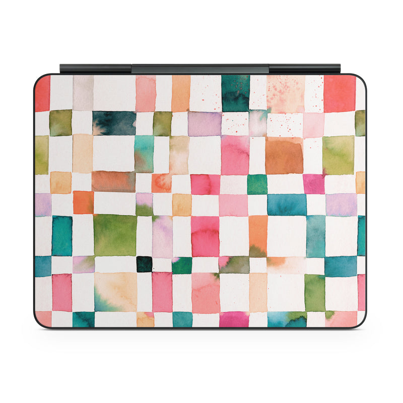 iStyles Magic Keyboard for iPad Series Skin design of Brown, Rectangle, Product, Textile, Art, Pink, Line, Aqua, Magenta, Symmetry, with white, pink, green, red, blue, orange, purple colors, and tagged with patterns, checkers, geometric, pattern, shapes, squares, watercolor.