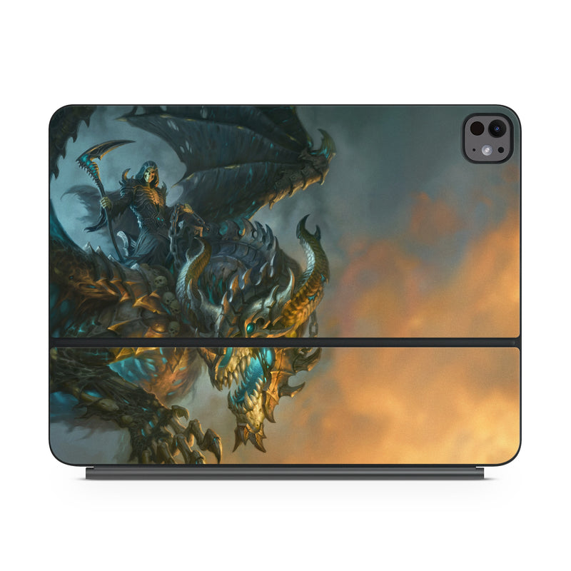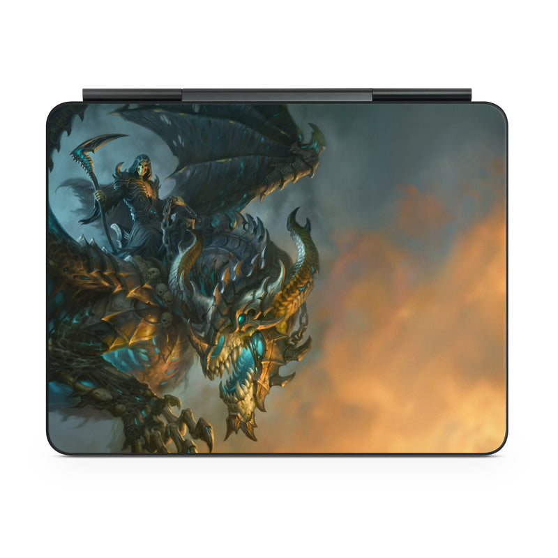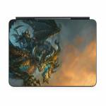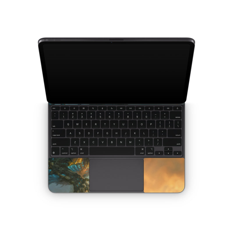 iStyles Magic Keyboard for iPad Series Skin design of Dragon, Cg artwork, Fictional character, Mythical creature, Demon, Mythology, Illustration, Cryptid, Art, with orange, yellow, black, brown, blue, white colors, and tagged with fantasy, animals, skulls, people, objects, bones, death, dragon, fire, grimreaper, skeleton.
