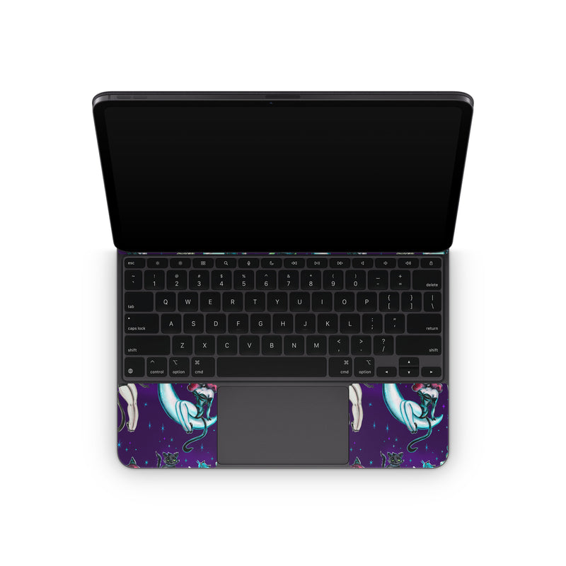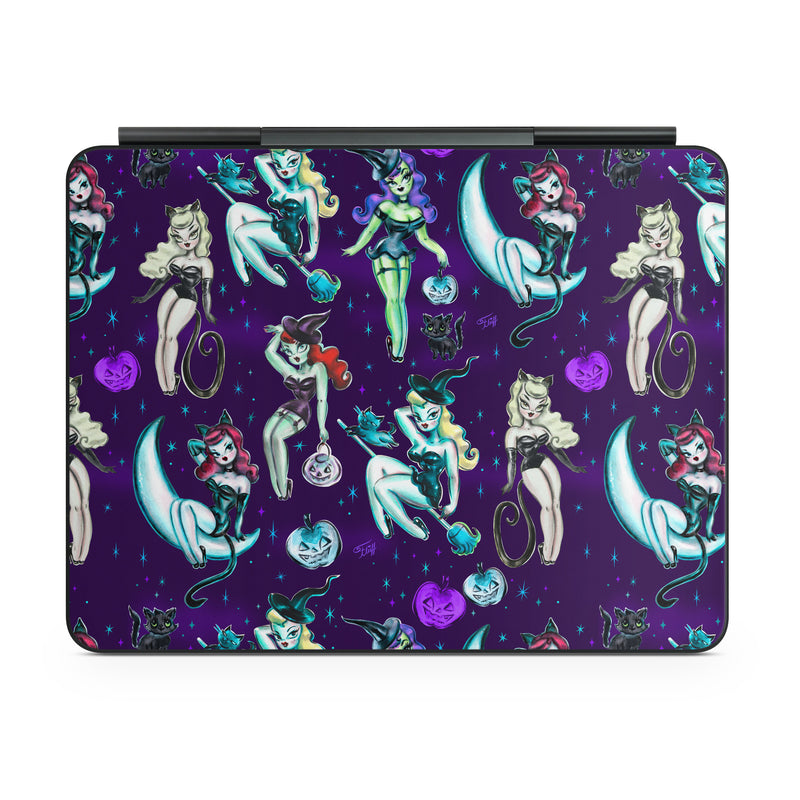 iStyles Magic Keyboard for iPad Series Skin design of Illustration, Cartoon, Violet, Art, Fictional character, Graphic design, Fiction, Visual arts, Style, Graphics, with blue, green, white, yellow, red, purple colors, and tagged with people, fantasy, objects, animals, blackcat, cat, halloween, pinup, pinupgirl, witche, witches.