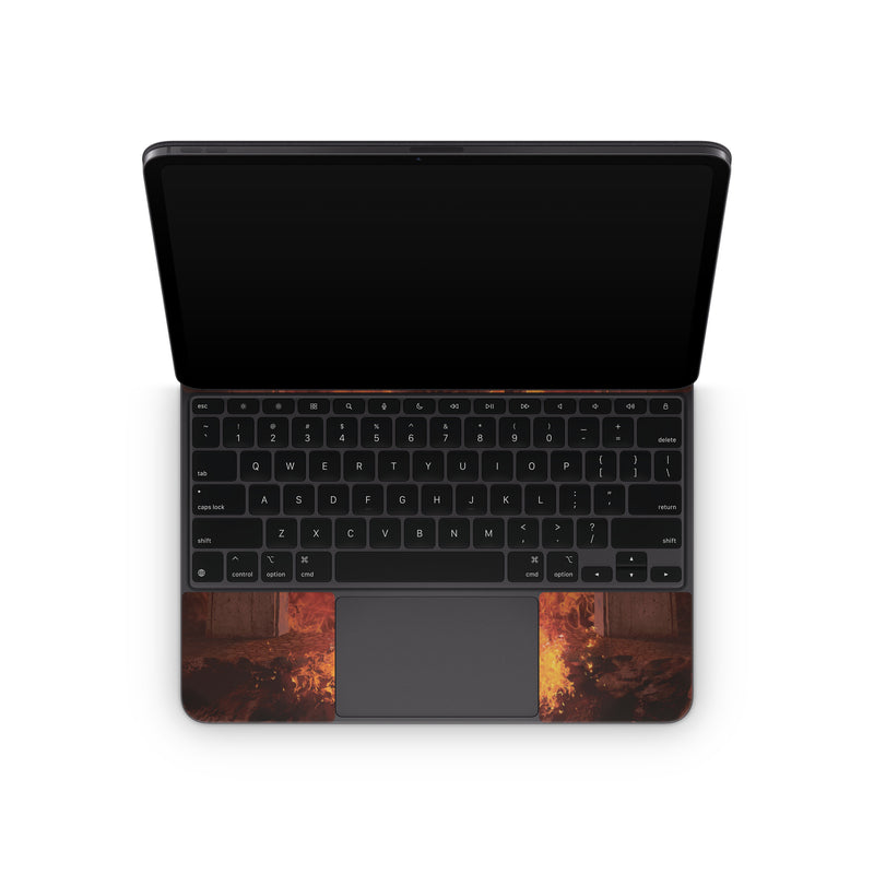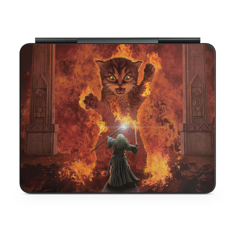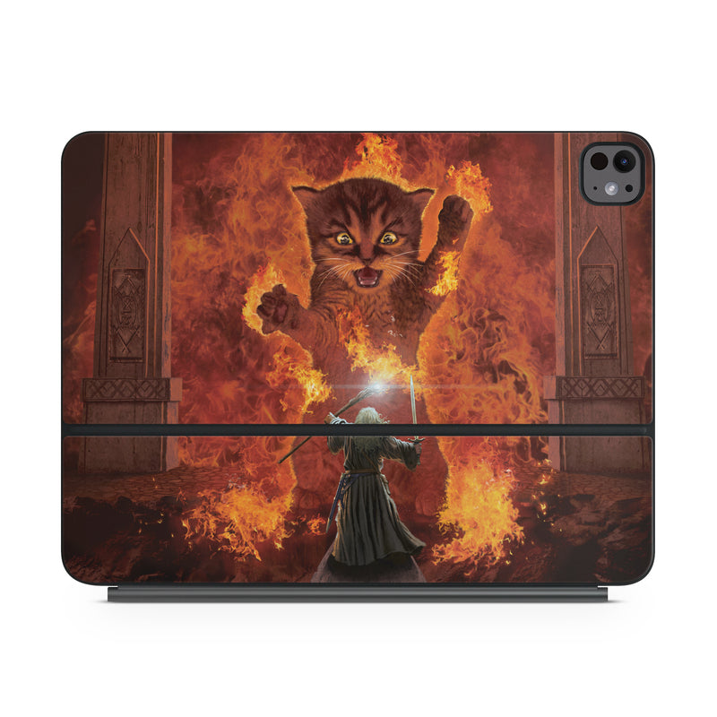 iStyles Magic Keyboard for iPad Series Skin design of Cartoon, Art, Carnivore, Cg artwork, Felidae, Supernatural creature, Big cats, Heat, Fictional character, Darkness, with black, red, white, gray, yellow colors, and tagged with animals, fantasy, objects, people, flames, cat, wizard, fire, sword, magic, gatekeeper.