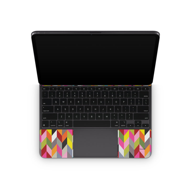 iStyles Magic Keyboard for iPad Series Skin design of Pattern, Orange, Line, Design, Graphic design, Tints and shades, Triangle, with red, green, gray, black, blue, purple colors, and tagged with patterns.