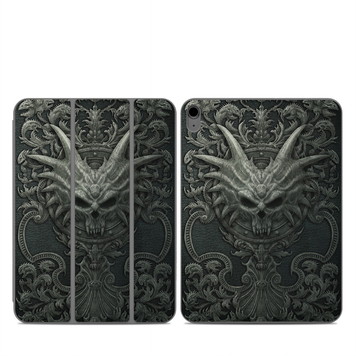 iStyles Smart Folio for iPad Series Skin design of Demon, Dragon, Fictional character, Illustration, Supernatural creature, Drawing, Symmetry, Art, Mythology, Mythical creature, with black, gray colors, and tagged with fantasy, patterns.