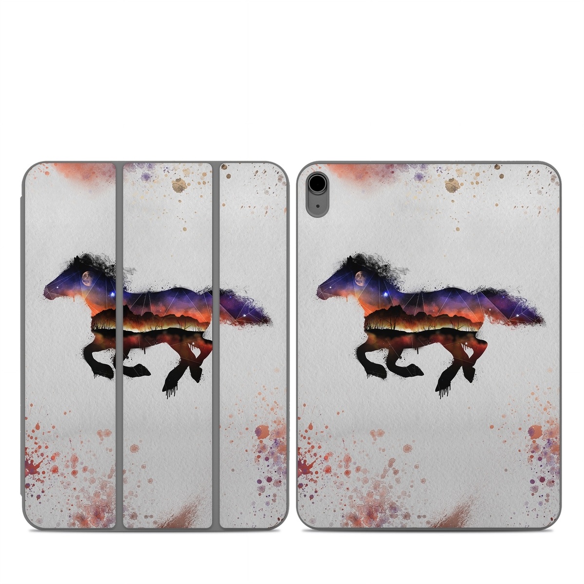 iStyles Smart Folio for iPad Series Skin design of Watercolor paint, Illustration, Art, Horse, Paint, Drawing, Graphic design, Painting, Visual arts, Mustang horse, with gray, white, purple, red, yellow, black, orange colors, and tagged with animals, nature, space, animals, horse, moon, nature, night, stars, watercolor.