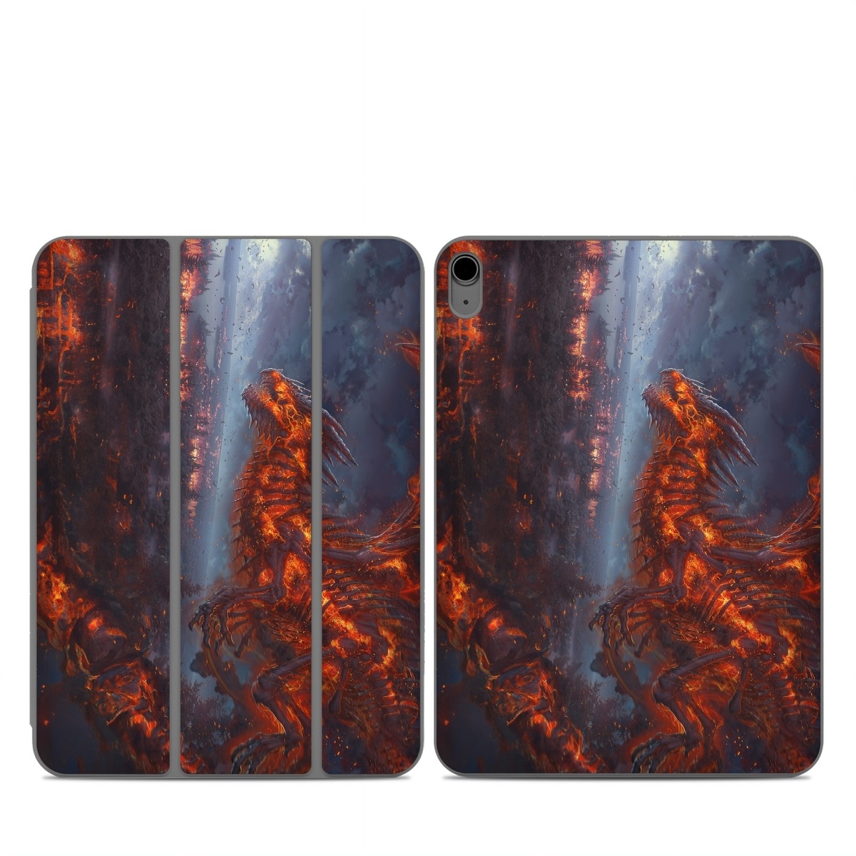 iStyles Smart Folio for iPad Series Skin design of Geological phenomenon, Dragon, Cg artwork, Sky, Flame, Fictional character, Mythology, Lava, Demon, Heat, with red, blue, black colors, and tagged with fantasy, animals, nature, dragon, fire, flame, monster, skeleton.