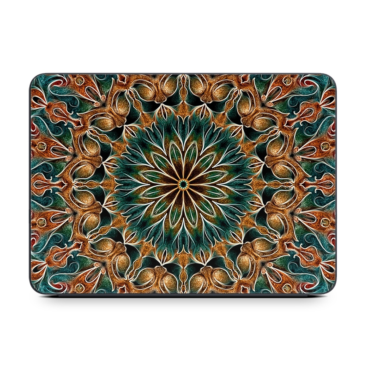 iStyles Smart Keyboard Folio for iPad Series Skin design of Pattern, Symmetry, Textile, Art, Psychedelic art, Tapestry, Design, Visual arts, Kaleidoscope, Motif, with green, orange, yellow, brown, red colors, and tagged with patterns, abstract, orange, teal.