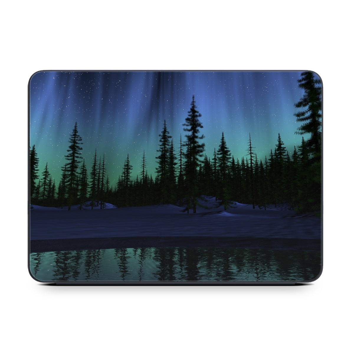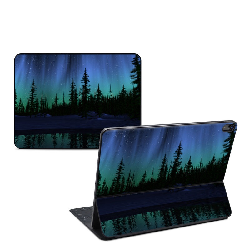 iStyles Smart Keyboard Folio for iPad Series Skin design of Aurora, Nature, Sky, shortleaf black spruce, Natural landscape, Tree, Wilderness, Natural environment, Biome, Spruce-fir forest, with blue, purple, green, black colors, and tagged with nature, photos.