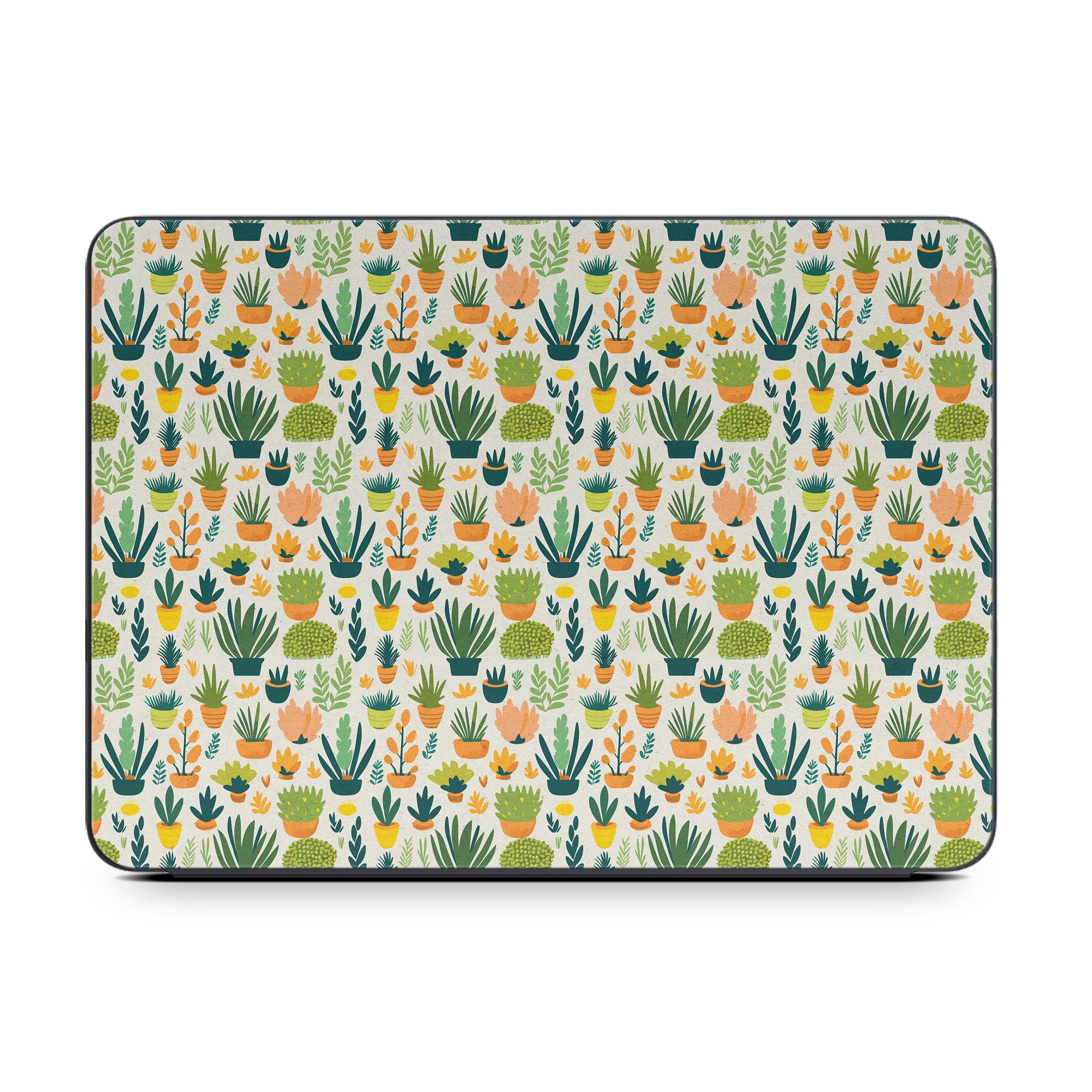 iStyles Smart Keyboard Folio for iPad Series Skin design of Flower, Plant, Petal, Textile, Botany, Art, Creative arts, Flowering plant, Porcelain, Groundcover, with white, green, brown, yellow, orange colors, and tagged with patterns, objects, nature, plants, pots, gardening, pattern.