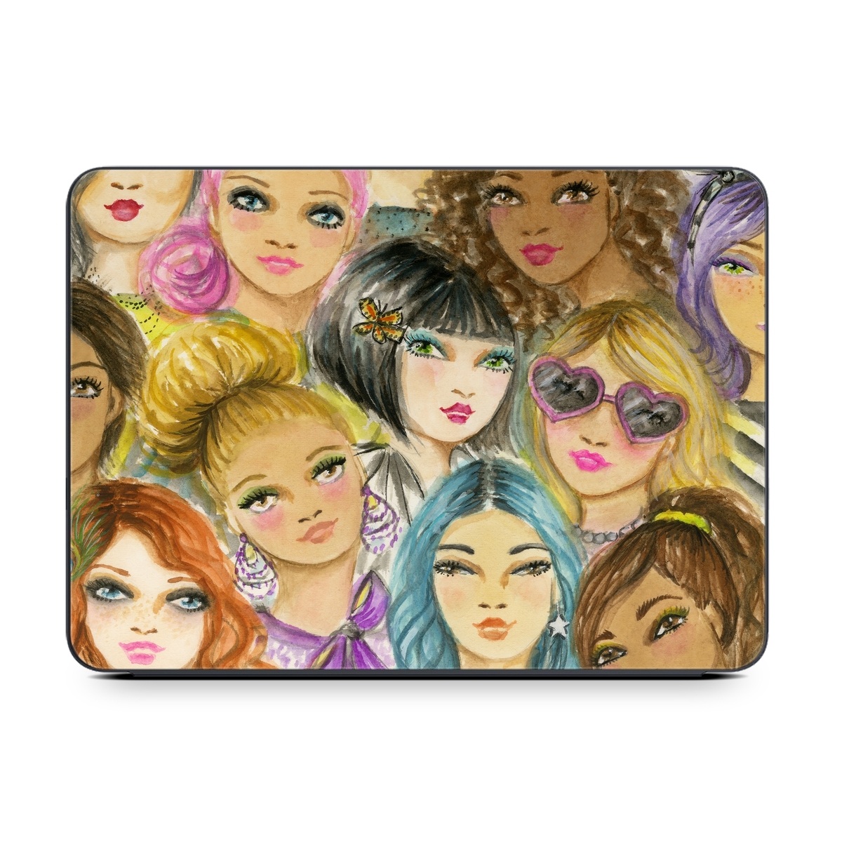 iStyles Smart Keyboard Folio for iPad Series Skin design of Face, Hair, Head, Art, Hair coloring, Cheek, Illustration, Human, Watercolor paint, Brown hair, with white, black, brown, yellow, purple, blue, pink colors, and tagged with people, fineart, flowers, drawn, face, faces, fashion, handdrawn, painting, portrait, woman, women, sunglasses, chinese, caucasian, black, eurasian, asian, european, african.