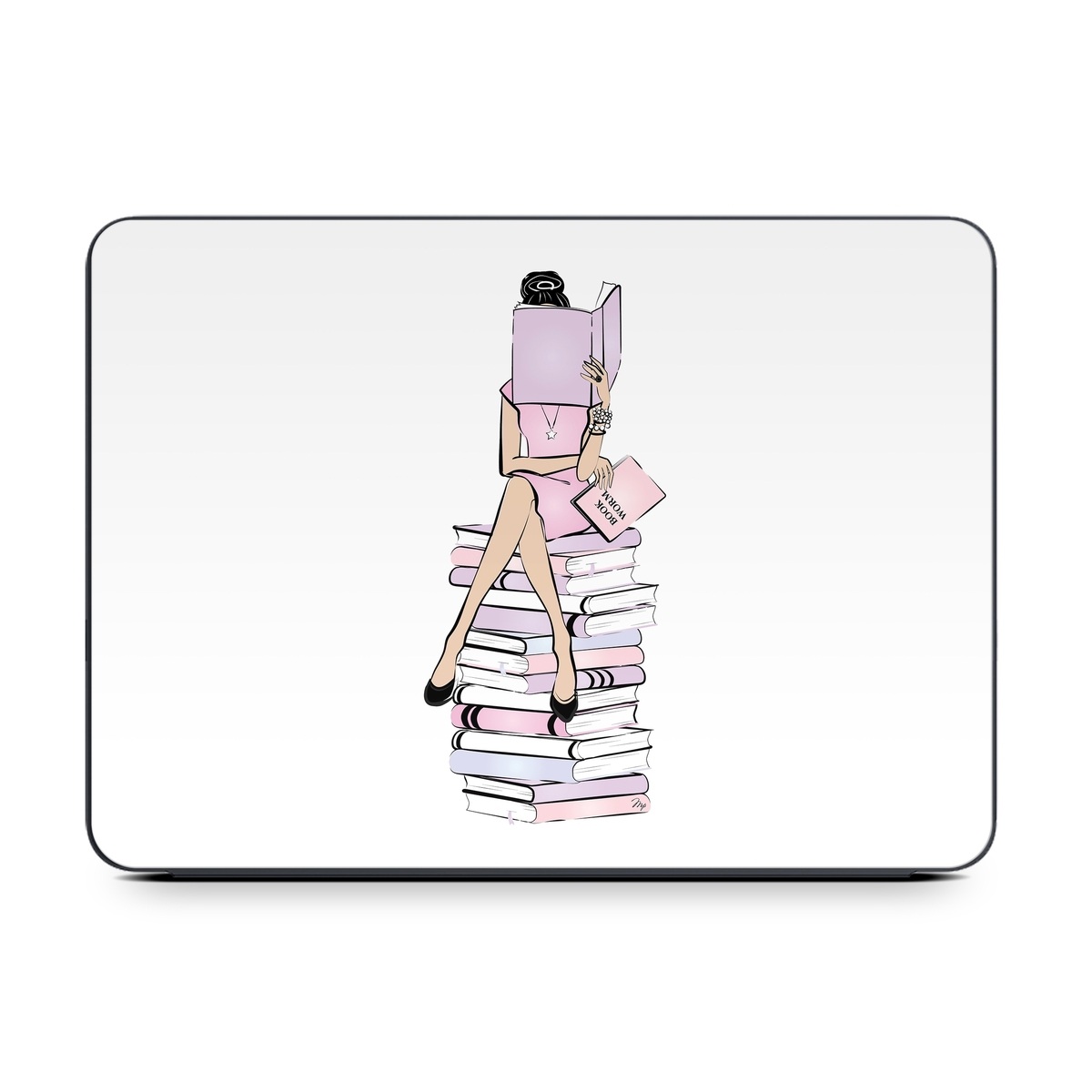 iStyles Smart Keyboard Folio for iPad Series Skin design of Gesture, Art, Cartoon, Font, Drawing, Illustration, Painting, Fictional character, Animation, Diagram, with black, white, pink, purple, blue, yellow, brown colors, and tagged with signs, objects, people, books, girl, pink, purple, reading.