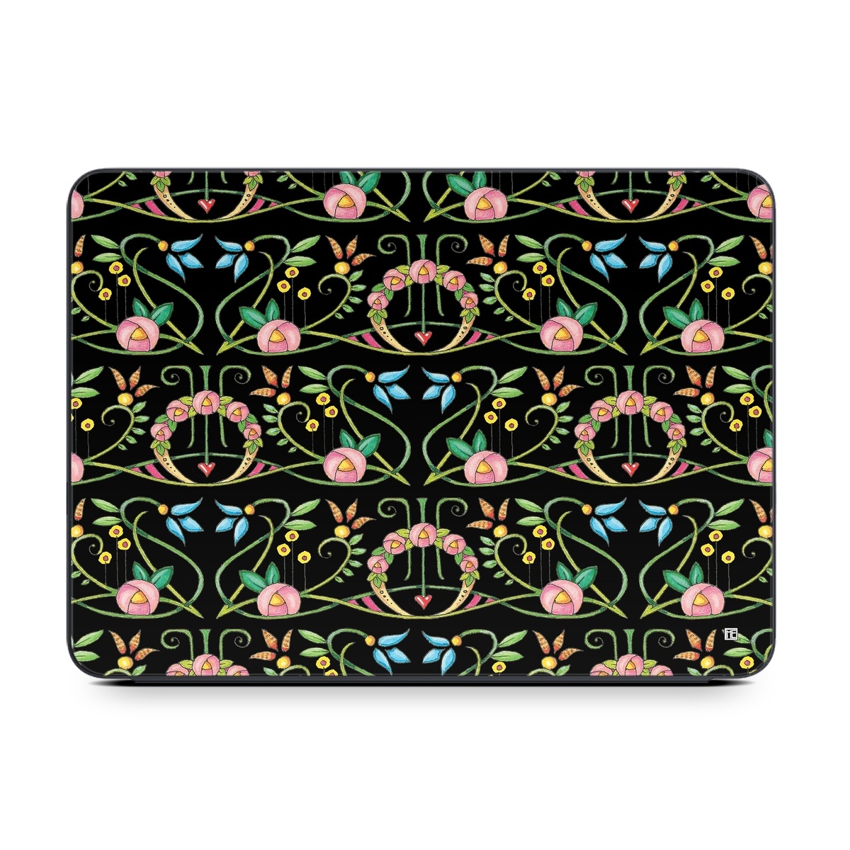 iStyles Smart Keyboard Folio for iPad Series Skin design of Flower, Rectangle, Textile, Ornament, Plant, Line, Motif, Creative arts, Art, Pattern, with black, pink, blue, green, yellow colors, and tagged with patterns, flowers, flower, arc, pattern.