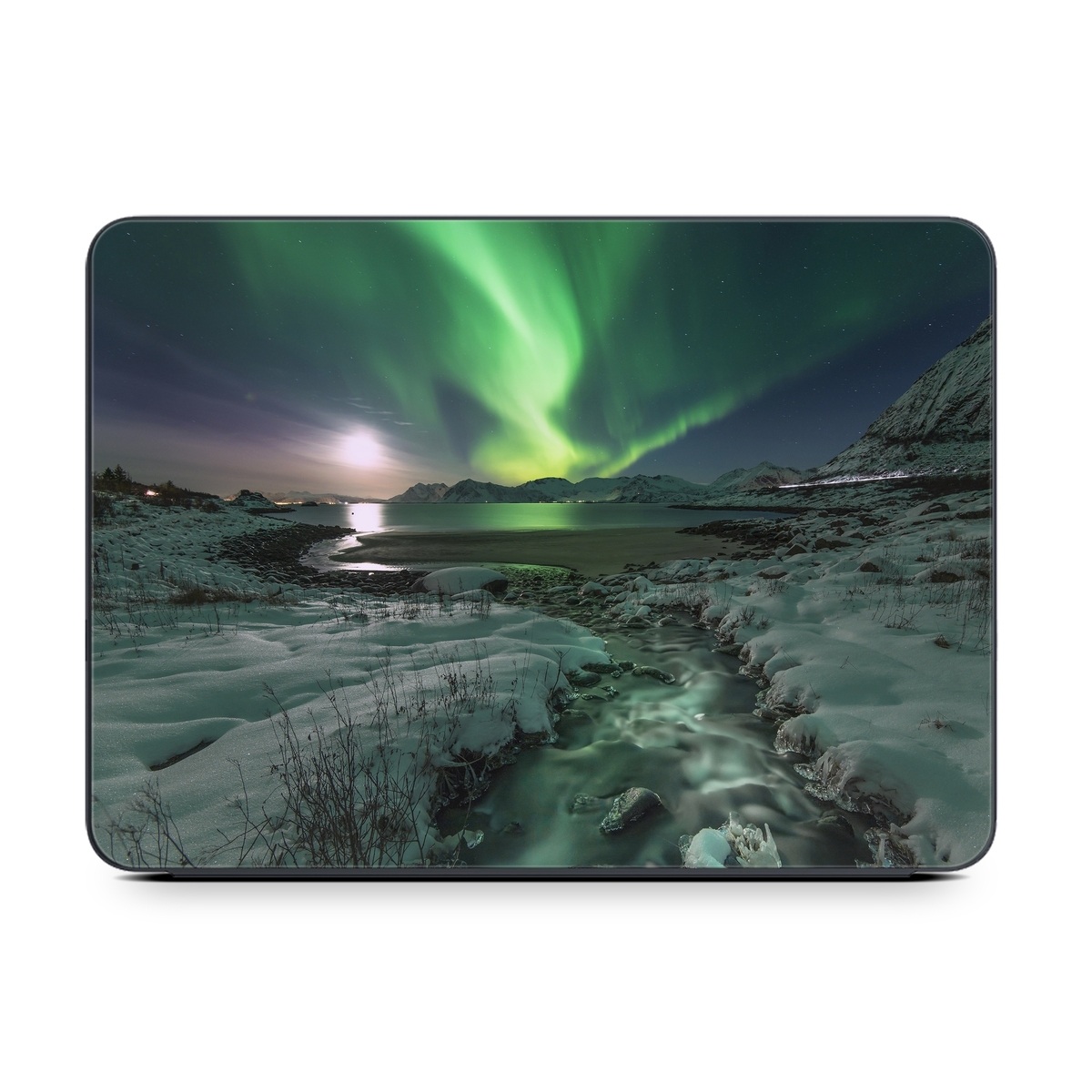 iStyles Smart Keyboard Folio for iPad Series Skin design of Nature, Aurora, Sky, Geological phenomenon, Water, Atmosphere, Space, Landscape, World, Glacier, with white, green, blue, black, gray colors, and tagged with nature, photos, arctic, cold, mountains, northernlights, photography, snow.