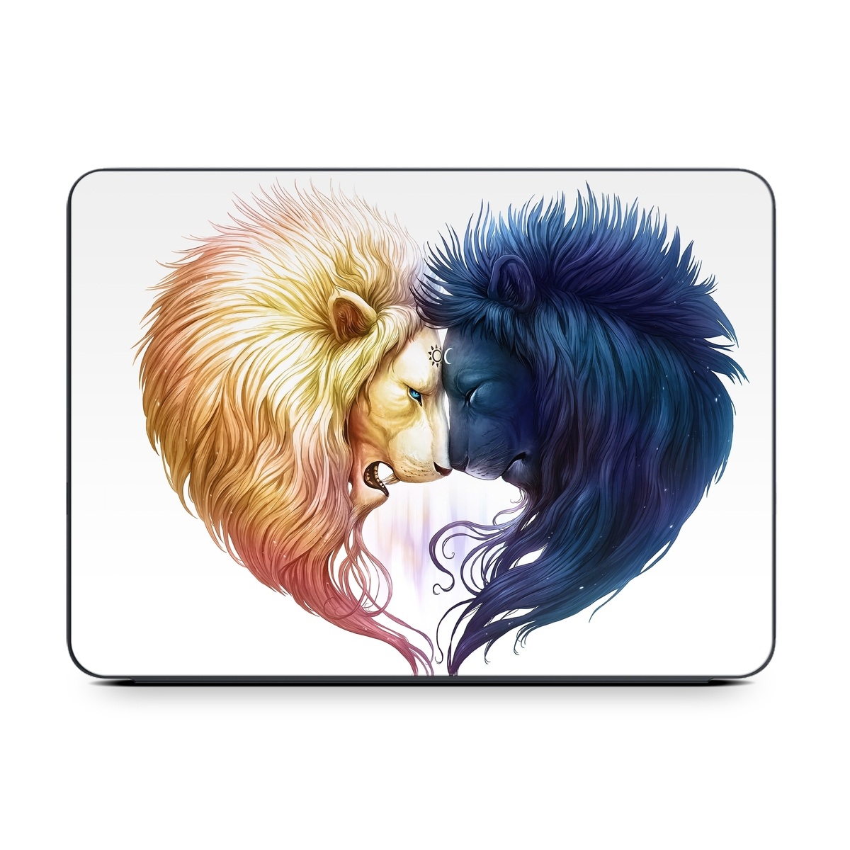 iStyles Smart Keyboard Folio for iPad Series Skin design of Vertebrate, Eyelash, Mammal, Ear, Gesture, Cartoon, Art, Painting, Happy, Paint, with white, black, blue, orange, yellow, red, purple colors, and tagged with animals, signs, blue, lion, yellow, yinyang.