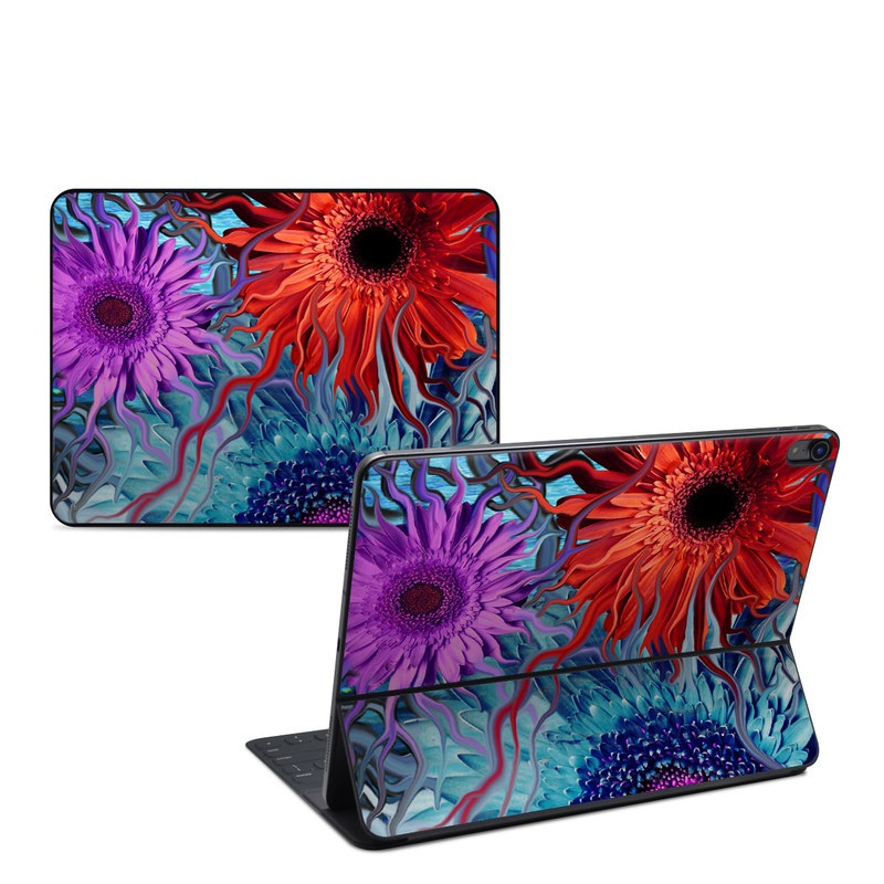iStyles Smart Keyboard Folio for iPad Series Skin design of Psychedelic art, Pattern, Organism, Colorfulness, Art, Flower, Petal, Design, Fractal art, Electric blue, with red, black, blue, purple, gray colors, and tagged with flowers.