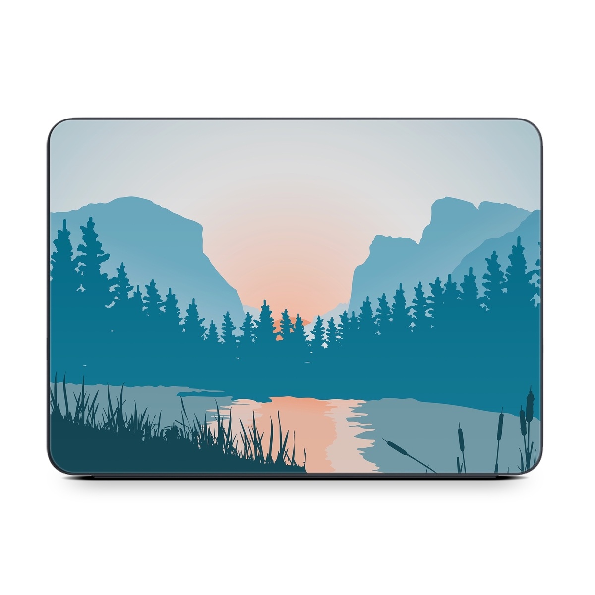 iStyles Smart Keyboard Folio for iPad Series Skin design of Sky, Atmosphere, Mountain, Ecoregion, Plant, Natural landscape, Larch, Highland, Fog, Atmospheric phenomenon, with blue, yellow, orange, green colors, and tagged with nature, sunset, mountain, forest, landscape, grass.