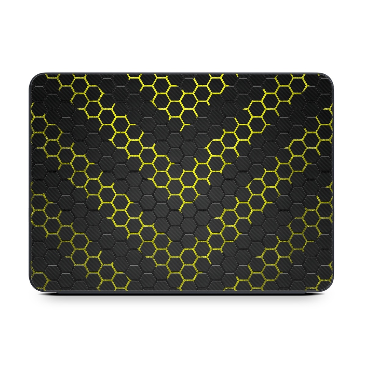 iStyles Smart Keyboard Folio for iPad Series Skin design of Black, Pattern, Yellow, Mesh, Net, Chain-link fencing, Design, Metal, with black, gray, yellow colors, and tagged with lookslike, space, fantasy, animals, drones, geometric, hexagon, tech.
