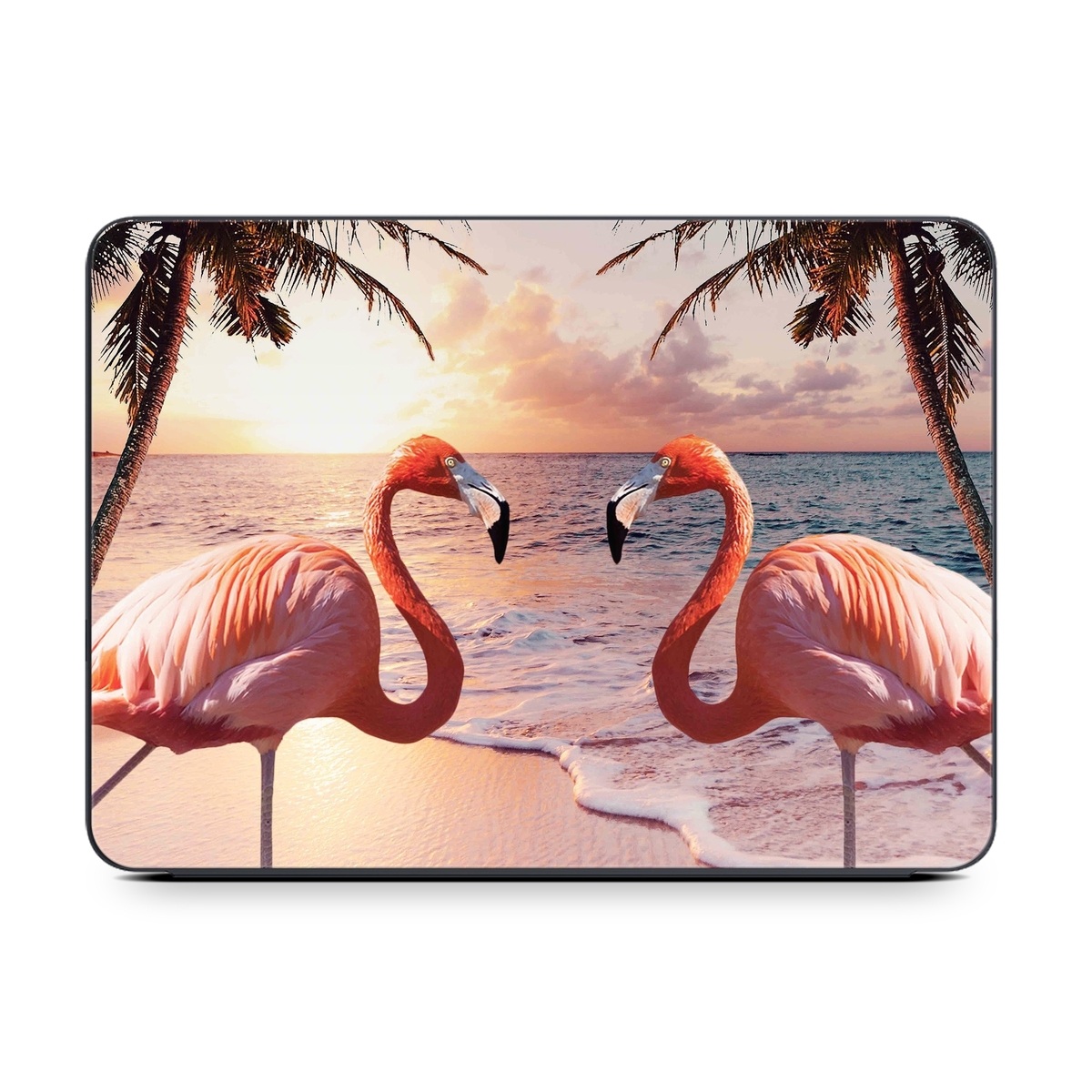 iStyles Smart Keyboard Folio for iPad Series Skin design of Flamingo, Greater flamingo, Bird, Water bird, Pink, Wildlife, Sky, Tree, Organism, Beak, with pink, blue, green, yellow, white, orange, black colors, and tagged with animals, nature, animal, animals, beach, bird, birds, flamingo, ocean, palm, palmtrees, pink, sunset, tropical, tropics.