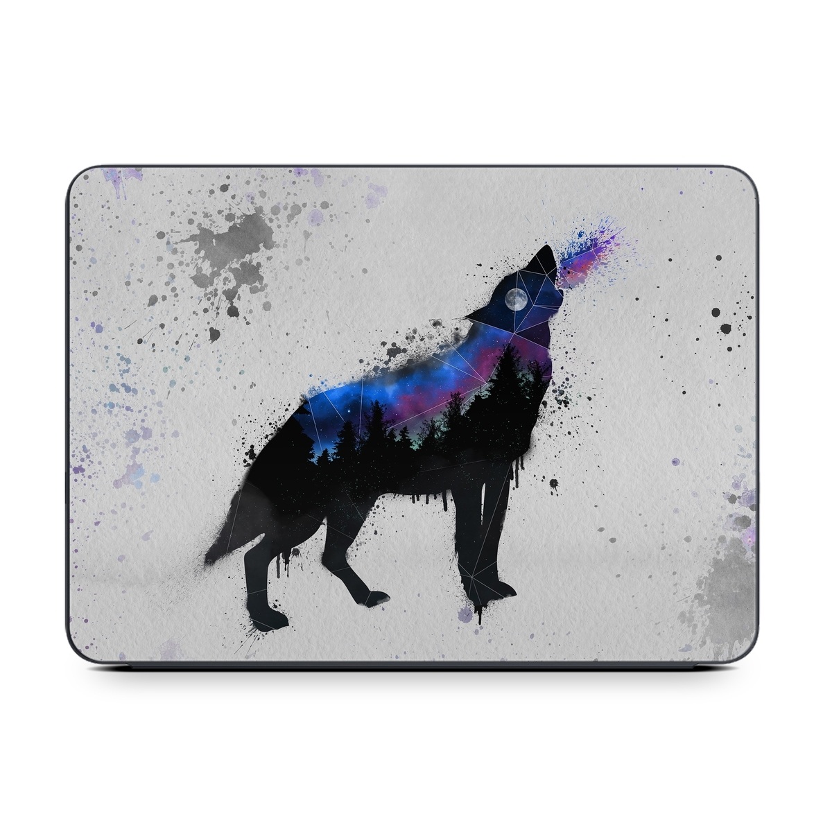 iStyles Smart Keyboard Folio for iPad Series Skin design of Canidae, Art, Illustration, Watercolor paint, Dog, Graphic design, Street art, Acrylic paint, Painting, Visual arts, with gray, white, blue, black, green, purple colors, and tagged with animals, nature, space, animals, coyote, dog, moon, nature, night, stars, watercolor, wolf.