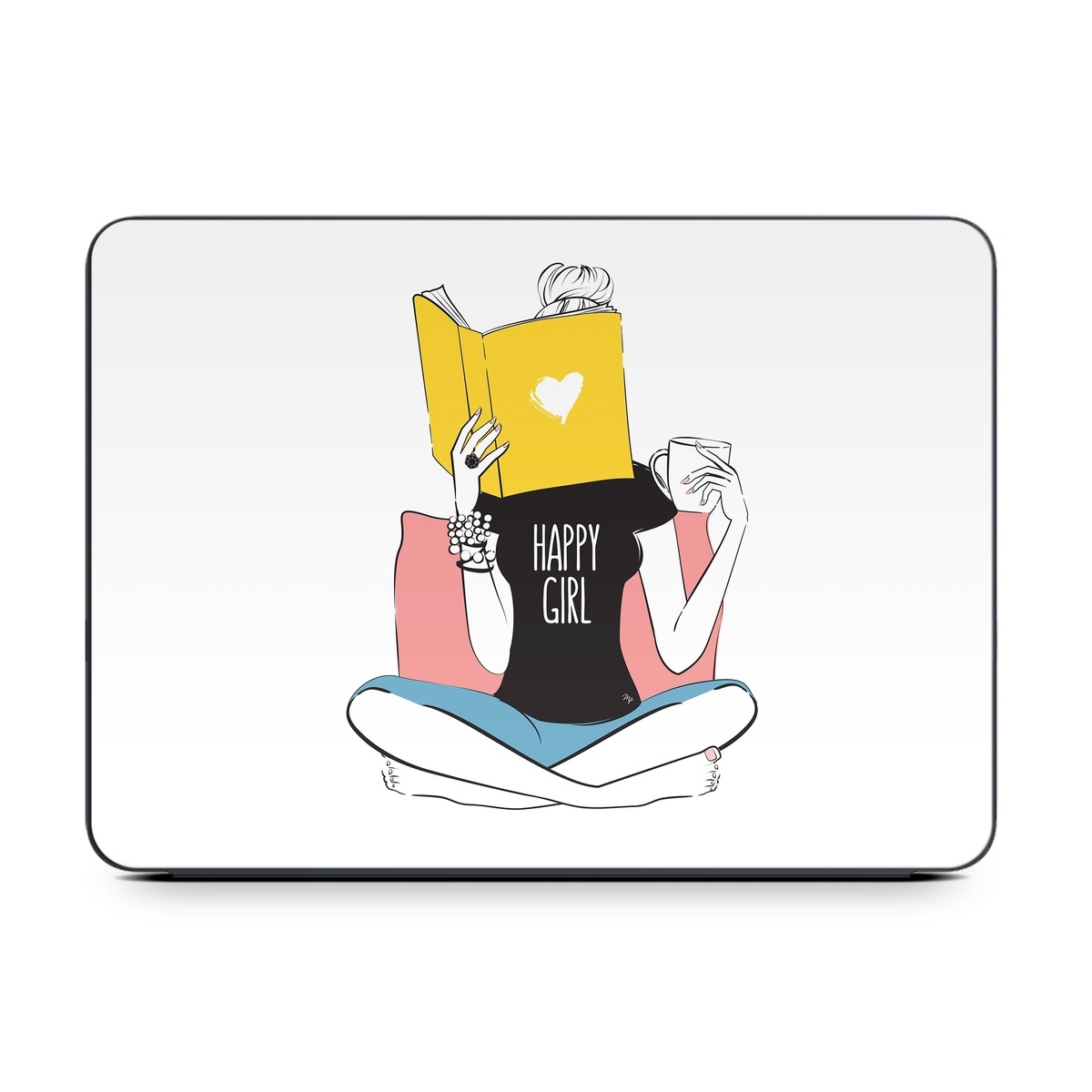 iStyles Smart Keyboard Folio for iPad Series Skin design of White, Sleeve, Gesture, Cartoon, Comfort, Elbow, Font, Graphics, Knee, Art, with white, black, blue, pink, yellow colors, and tagged with objects, people, signs, hearts, reading, happy, cup, coffee, girl.