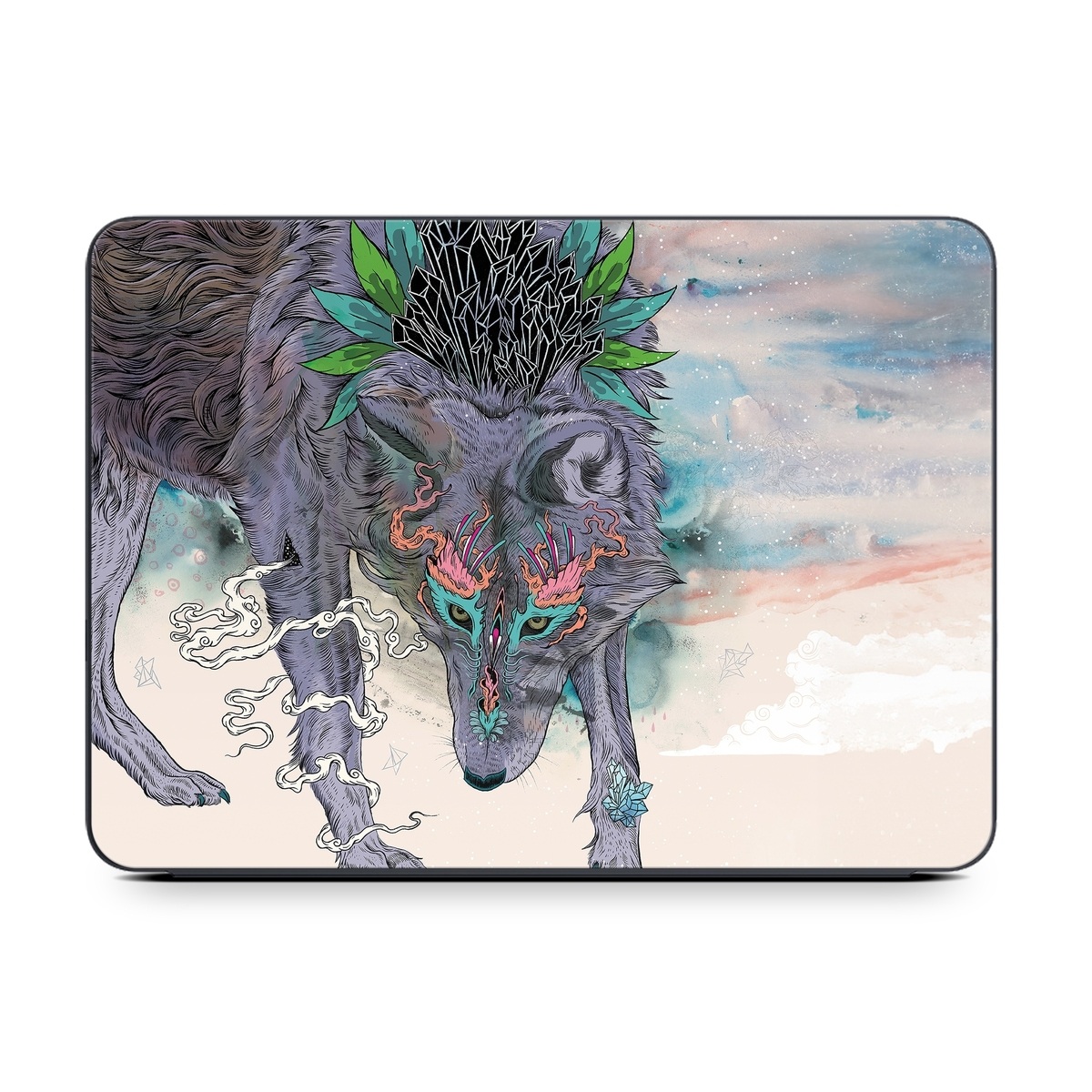 iStyles Smart Keyboard Folio for iPad Series Skin design of Illustration, Boar, Art, Drawing, Fictional character, Sketch, Suidae, with gray, pink, black, blue, yellow colors, and tagged with animals, fantasy, crystals, feathers, gems, magical, space, spirit, tribal, wolf.