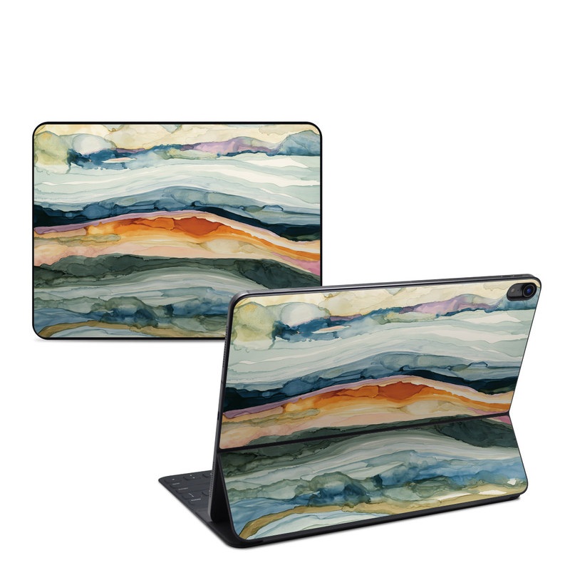 iStyles Smart Keyboard Folio for iPad Series Skin design of Watercolor paint, Painting, Sky, Wave, Geology, Landscape, Pattern, Acrylic paint, Cloud, Paint, with blue, purple, orange, yellow, red, green, brown colors, and tagged with patterns, abstract, nature, abstract, earthy, watercolor.