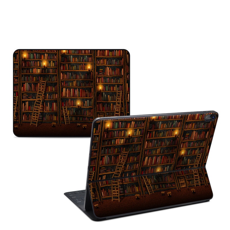 iStyles Smart Keyboard Folio for iPad Series Skin design of Shelving, Library, Bookcase, Shelf, Furniture, Book, Building, Publication, Room, Darkness, with black, red colors, and tagged with fineart, objects.